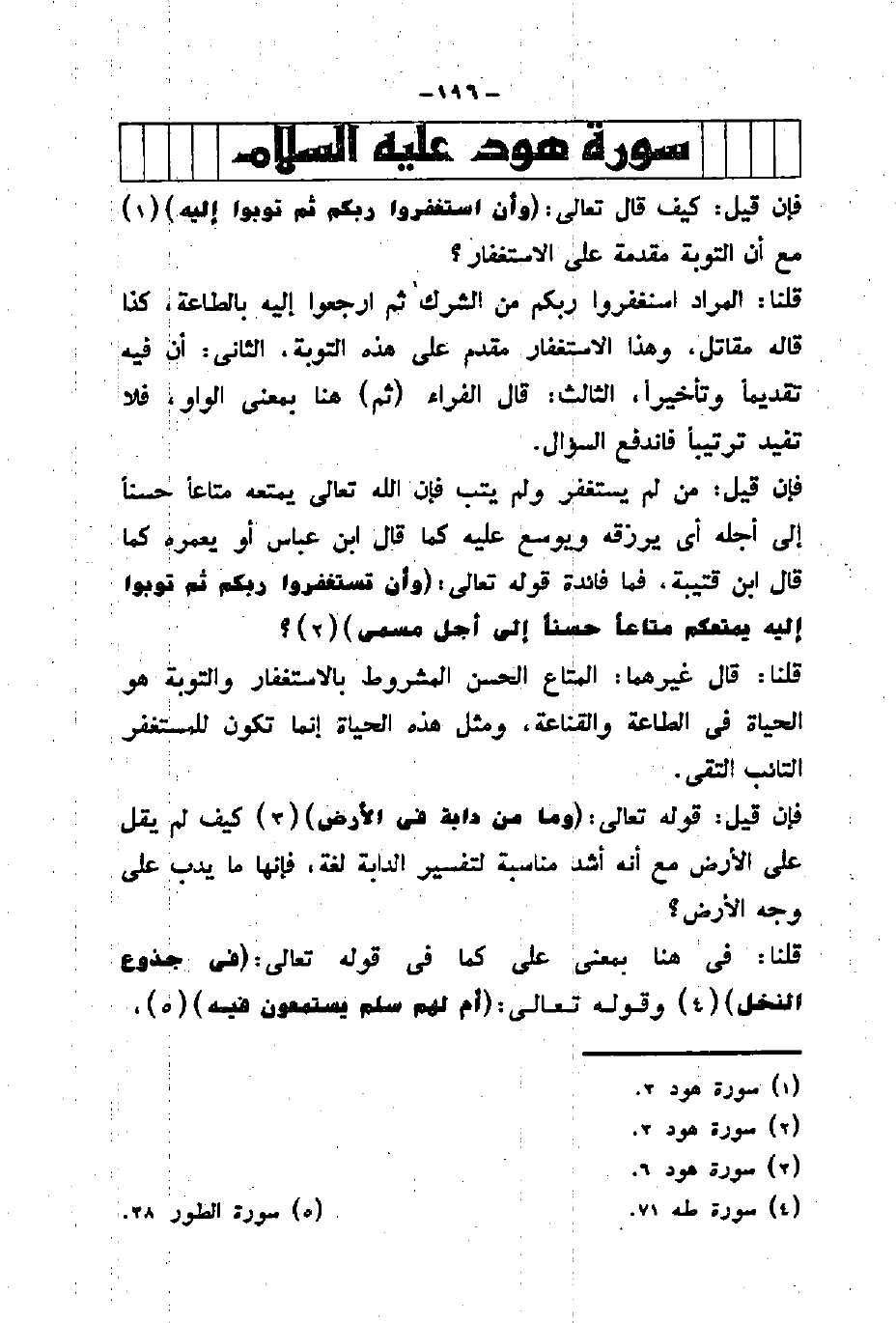 قلنا: المراد استغفروا ربكم من الشرك ثم ارجعوا إليه بالطاعة، كذا قاله مقاتل، وهذا الاستغفار مقدم على هذه التوبة، الثانى: أن فيه تقديما وتأخيرا، الثالث: قال الفراء (ثم) هنا بمعنى الواو، فلا تفيد ترتيبا فاندفع السؤال.