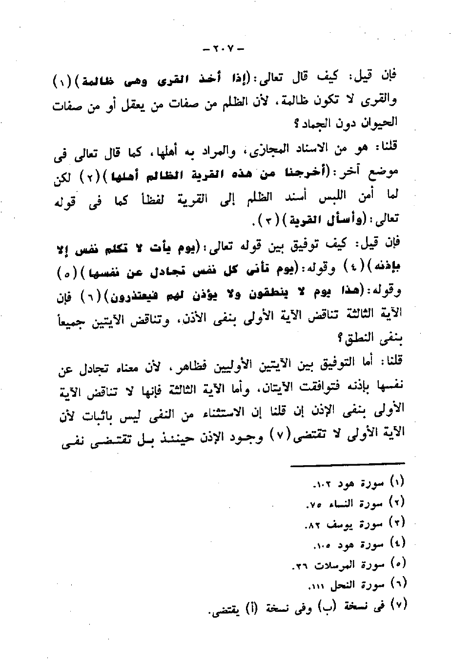 قلنا: أما التوفيق بين الآيتين الأوليين فظاهر، لأن معناه تجادل عن نفسها بإذنه فتوافقت الآيتان، وأما الآية الثالثة فإنها لا تناقض الآية الأولى بنفى الإذن إن قلنا إن الاستثناء من النفى ليس بإثبات لأن الآية الأولى لا تقتضى وجود الإذن حينئذ بل تقتضى نفى