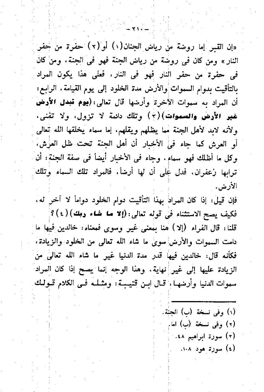 " إن القبر إما روضة من رياض الجنان أو حفرة من حفر النار " ومن كان في روضة من رياض الجنة فهو في الجنة، ومن كان في حفرة من حفر النار فهو في النار، فعلى هذا يكون المراد بالتأقيت بدوام السموات والأرض مدة الخلود إلى يوم ألقيامة، الرابع: أن المراد به سموات الآخرة وأرضها قال تعالى: (يَوْمَ تُبَدَّلُ الْأَرْضُ غَيْرَ الْأَرْضِ) وتلك دائمة لا تزول، ولا تفنى.