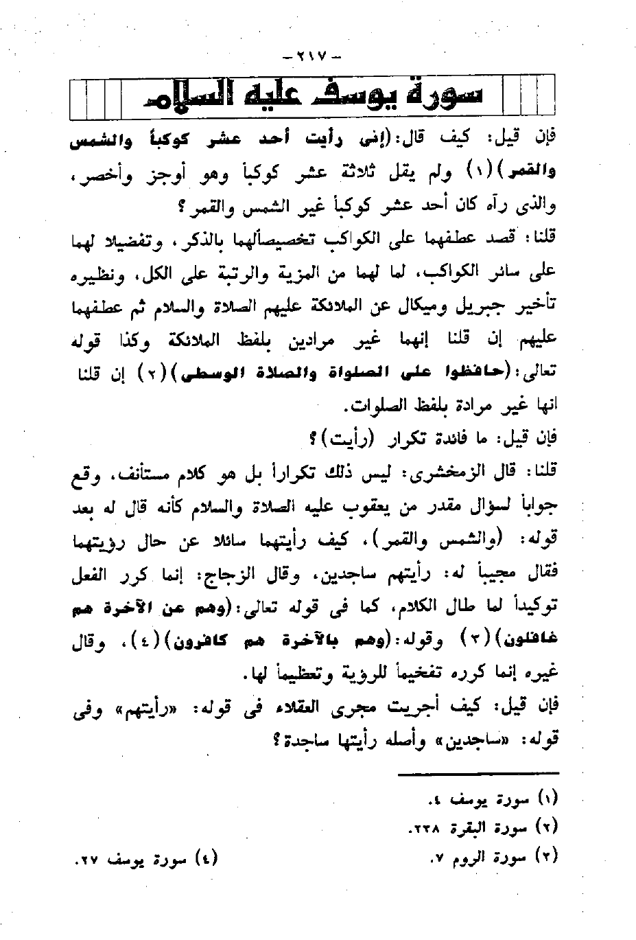قلنا: قال الزمخشري: ليس ذلك تكرارا بل هو كلام مستأنف، وقع جوابا لسؤال مقدر من يعقوب عليه الصلاة والسلام كأنه قال له بعد قوله: (وَالشَّمْسَ وَالْقَمَرَ) ، كيف رأيتهما سائلا عن حال رؤيتهما