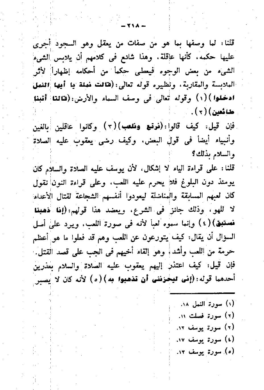 قلنا: لما وصفها بما هو من صفات من يعقل وهو السجود أجرى عليها حكمه، كأنها عاقلة، وهذا شائع في كلامهم أن يلبس الشيء الشيء من بعض الوجوه فيعطى حكما من أحكامه إظهارا لأثر الملابسة والمقاربة، ونظيره قوله تعالى: (قَالَتْ نَمْلَةٌ يَا أَيُّهَا النَّمْلُ ادْخُلُوا) وقوله تعالى في وصف السماء والأرض: (قَالَتَا أَتَيْنَا طَائِعِينَ) .