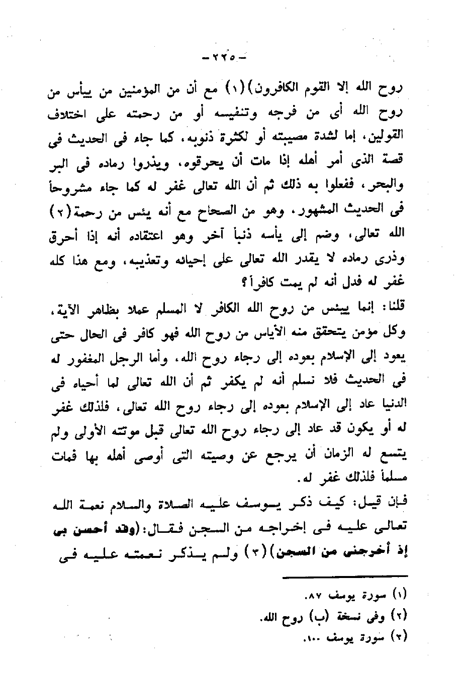 قلنا: إنما ييأس من روح الله الكافر لا المسلم عملا بظاهر الآية، وكل مؤمن يتحقق منه الأياس من روح الله فهو كافر في الحال حتى يعود إلى الإسلام بعوده إلى رجاء روح ألله، وأما الرجل المغفور له في الحديث فلا نسلم أنه لم يكفر ثم أن الله تعالى لما أحياه في الدنيا عاد إلى الإسلام بعوده إلى رجاء روح الله تعالى، فلذلك غفر