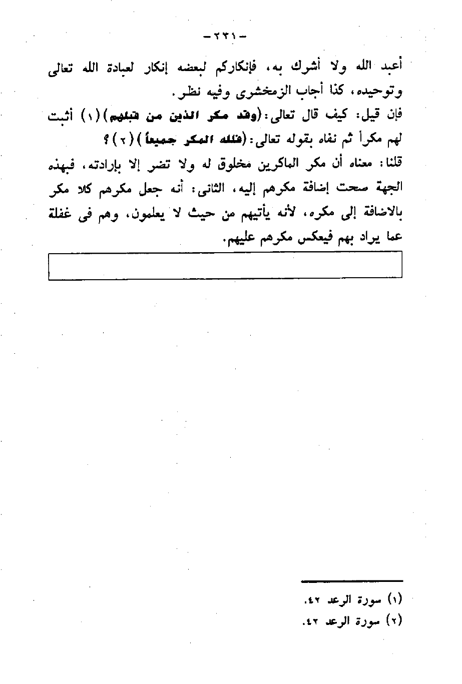 قلنا: معناه أن مكر الماكرين مخلوق له ولا تضر إلا بإرادته، فبهذه الجهة صحت إضافة مكرهم إليه، الثانى: أنه جعل مكرهم كلا مكر بالإضافة إلى مكره، لأنه يأتيهم من حيث لا يعلمون، وهم في غفلة عما يراد بهم فيعكس مكرهم عليهم.