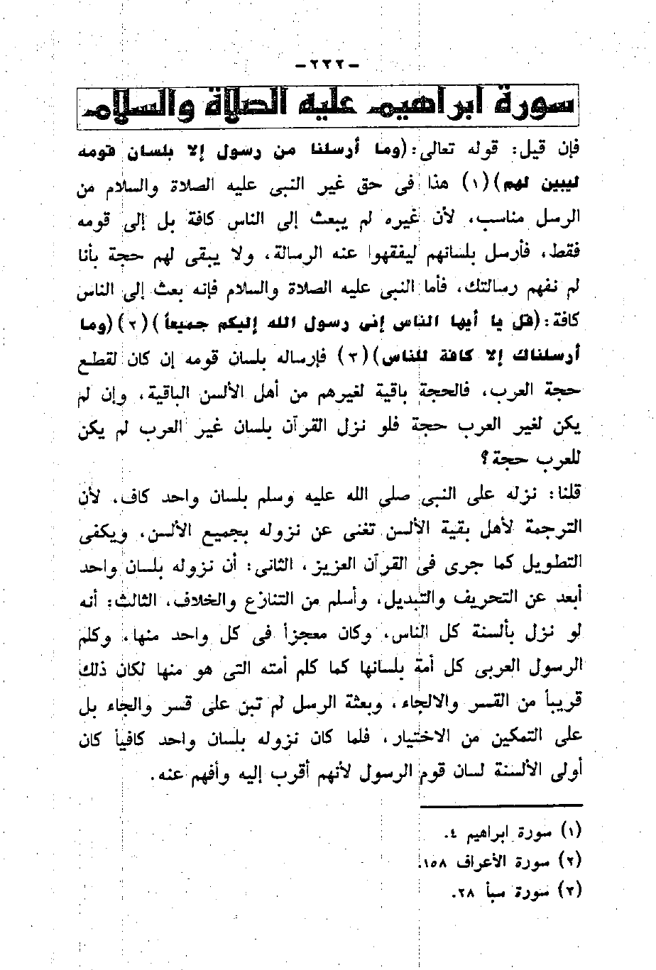قلنا: نزله على النبى صلى الله عليه وسلم بلسان واحد كاف، لأن الترجمة لأهل بقية الألسن تغنى عن نزوله بجميع الألسن، ويكفى التطويل كما جرى في القرآن العزيز، الثانى: أن نزوله بلسان واحد