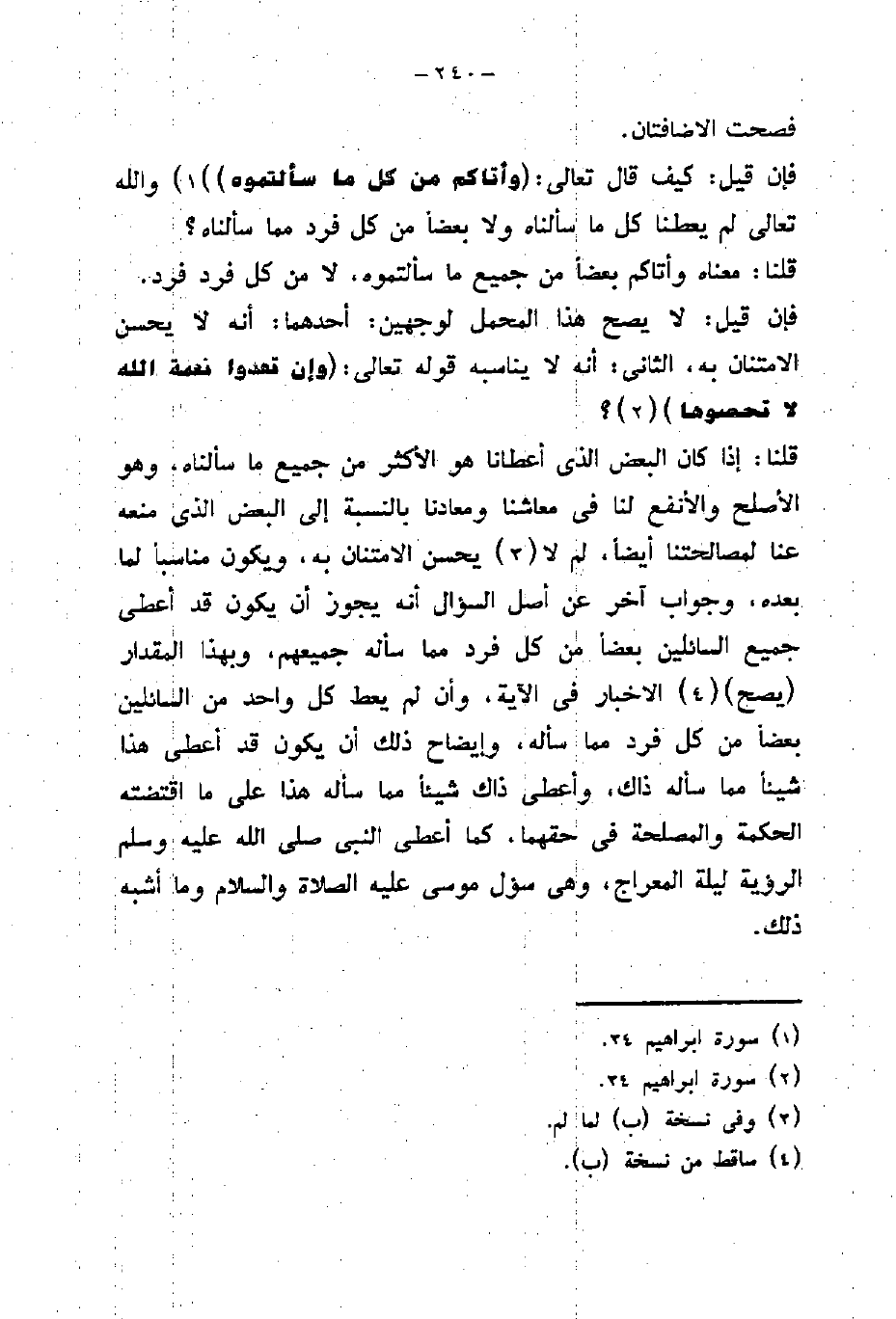 قلنا: إذا كان البعض الذي أعطانا هو الأكثر من جميع ما سألناه وهو الأصلح والأنفع لنا في معاشنا ومعادنا بالنسبة إلى البعض الذي منعه عنا لمصالحتنا أيضا، لم لا يحسن الامتنان به ويكون مناسباً لما بعده، وجواب آخر عن أصل السؤال أنه يجوز أن يكون قد أعطى جميع السائلين بعضاً من كل فرد مما سأله جميعهم وبهذا المقدار يصح الإخبار في الآية، وأن يعط كل واحد من السائلين