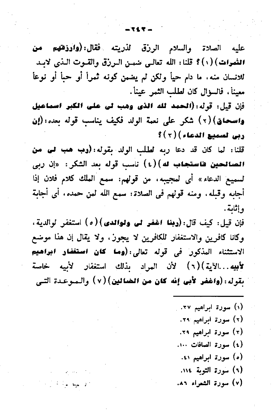 فإن قيل: كيف قال: (رَبَّنَا اغْفِرْ لِي وَلِوَالِدَيَّ) استغفر لوالدية، وكانا كافرين والاستغفار للكافرين لا يجوز، ولا يقال أن هذا موضع الاستثناء المذكور في قوله تعالى: (وَمَا كَانَ اسْتِغْفَارُ إِبْرَاهِيمَ لِأَبِيهِ ... الآية) لأن المراد بذلك استغفار لأبيه خاصة بقوله: (وَاغْفِرْ لِأَبِي إِنَّهُ كَانَ مِنَ الضَّالِّينَ) والموعدة التى