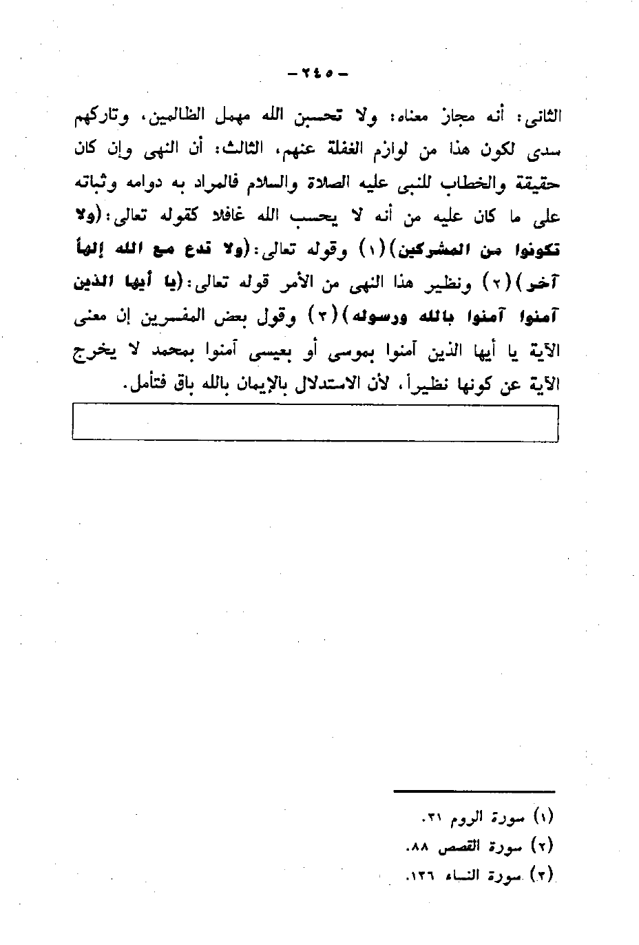 على ما كان عليه من أنه لا يحسب الله غافلا كقوله تعالى: (وَلَا تَكُونُوا مِنَ الْمُشْرِكِينَ) وقوله تعالى: (فَلَا تَدْعُ مَعَ اللَّهِ إِلَهًا آخَرَ) ونظير هذا النهى من الأمر قوله تعالى: (يَا أَيُّهَا الَّذِينَ آمَنُوا آمِنُوا بِاللَّهِ وَرَسُولِهِ) وقول بعض المفسرين إن معنى الآية يا أيها الذين آمنوا بموسى أو بعيسى آمنوا بمحمد لا يخرج الآية عن كونها نظيرا، لأن الاستدلال بالإيمان بألله باق فتأمل.