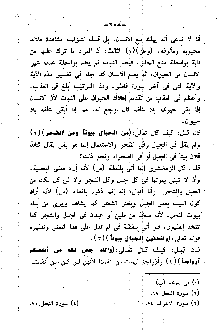 أنا لا ندعى أنه يهلك مع الإنسان، بل قبله لتؤلمه مشاهدة هلاك محبوبه ومألوفه، (وعن) الثالث: أن المراد ما ترك عليها من دابة بواسطة منع المطر، فيعدم النبات ثم يعدم بواسطة عدمه غير الإنسان من الحيوان، ثم يعدم الإنسان كذا جاء في تفسير هذه الآية والآية التى في آخر سورة فاطر، وهذا الترتيب أبلغ في العذاب.