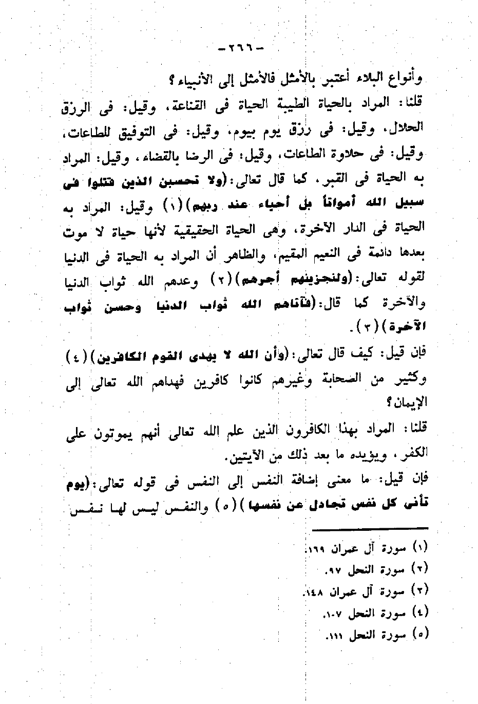 قلنا: المراد بالحياة الطيبة الحياة في القناعة، وقيل: في الرزق الحلال، وقيل: في رزق يوم بيوم، وقيل: في التوفيق للطاعات، وقيل: في حلاوة الطاعات، وقيل: في الرضا بالقضاء، وقيل: المراد به الحياة في القبر، كما قال تعالى: (وَلَا تَحْسَبَنَّ الَّذِينَ قُتِلُوا فِي سَبِيلِ اللَّهِ أَمْوَاتًا بَلْ أَحْيَاءٌ عِنْدَ رَبِّهِمْ) ، قيل: المراد به الحياة في الدار الآخرة، وهى الحياة الحقيقية لأنها حياة لا موت