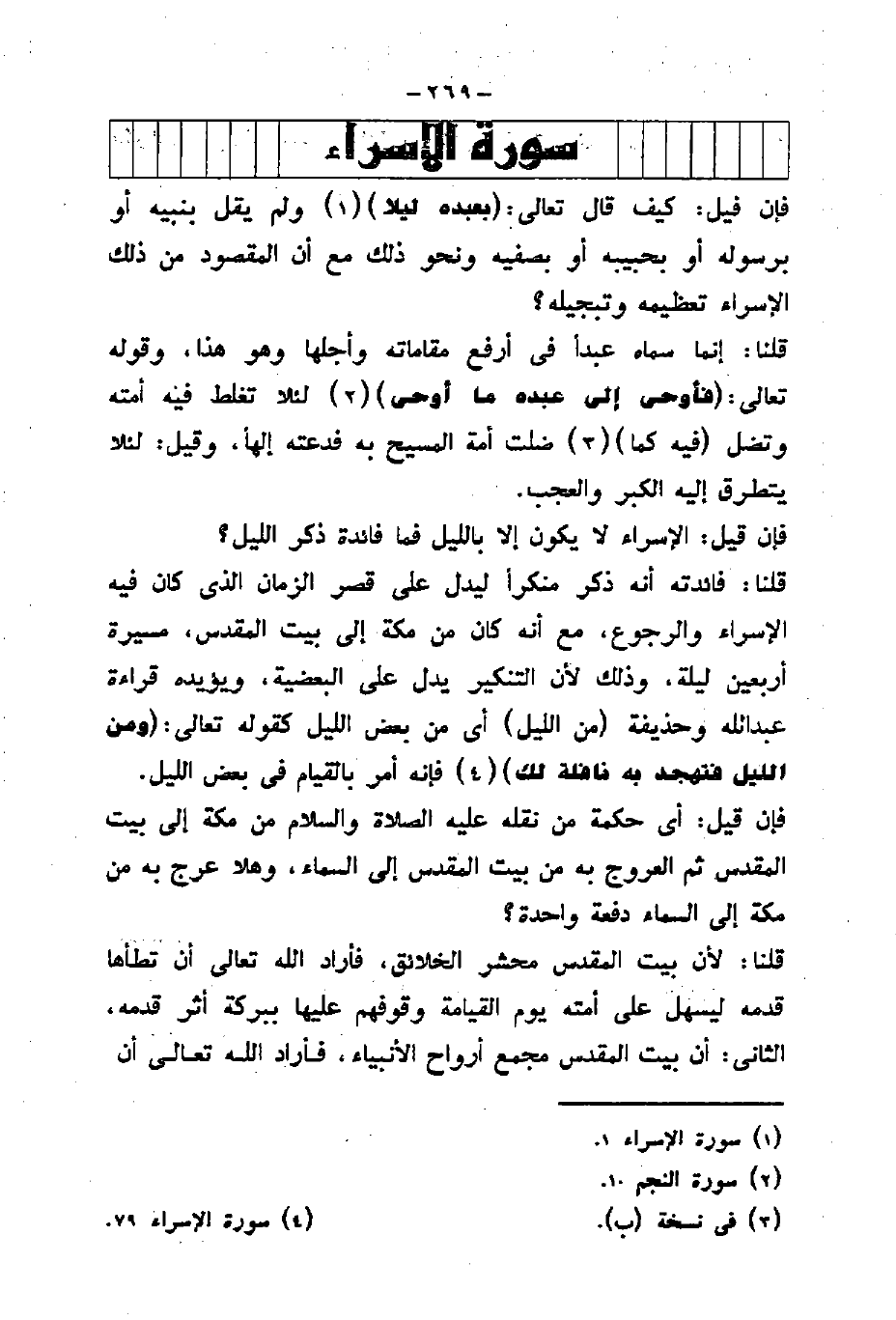 قلنا: فائدته أنه ذكر منكراً ليدل على قصر الزمان الذي كان فيه الإسراء والرجوع، مع أنه كان من مكة إلى بيت المقدس، مسيرة أربعين ليلة، وذلك لأن التنكير يدل على البعضية، ويؤيده قراءة عبد الله وحذيفة (من الليل) أي من بعض الليل كقوله تعالى: (وَمِنَ اللَّيْلِ فَتَهَجَّدْ بِهِ نَافِلَةً لَكَ) فإنه أمر بالقيام في بعض الليل.