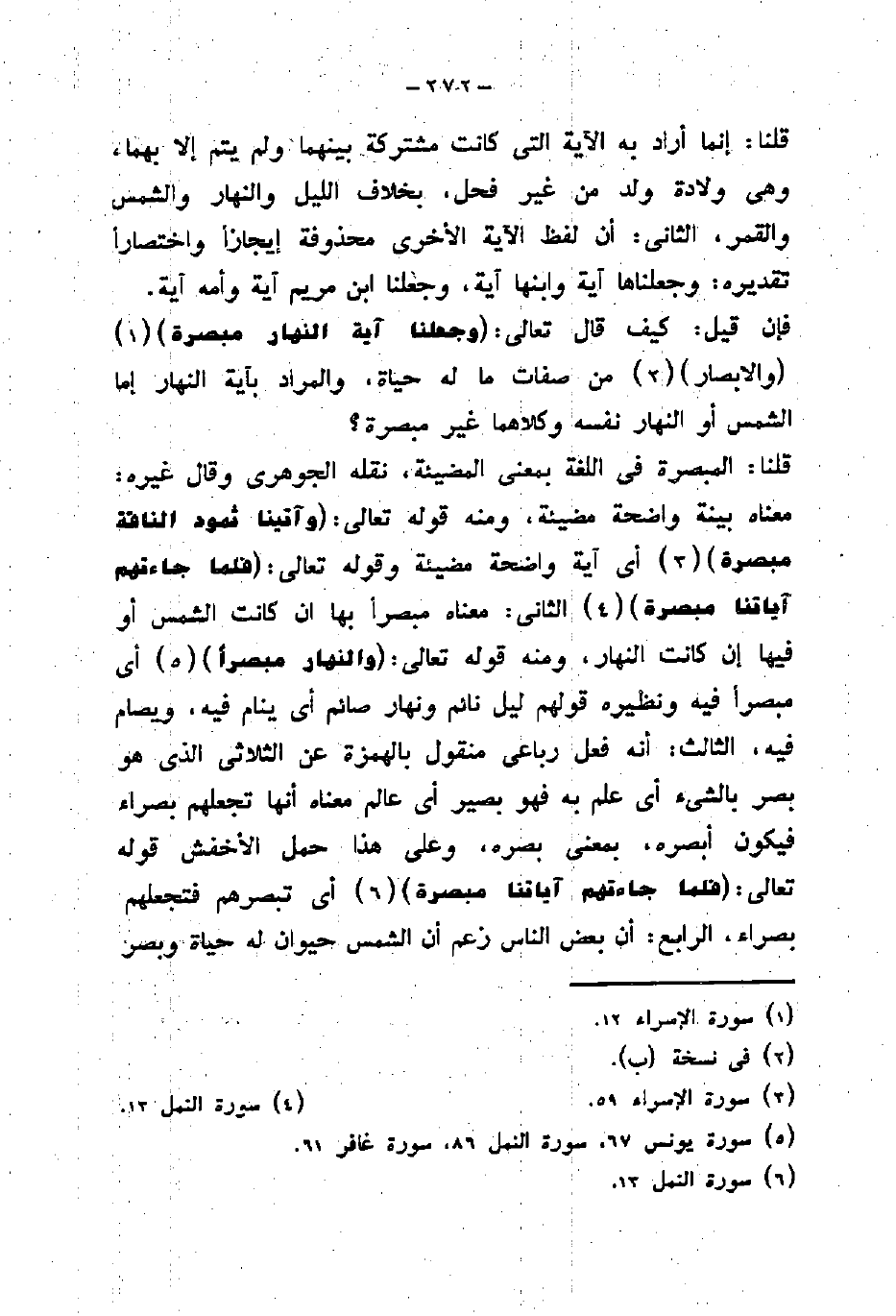 معناه بينة واضحة مضيئة، ومنه قوله تعالى: (وَآتَيْنَا ثَمُودَ النَّاقَةَ مُبْصِرَةً) أي آية واضحة مضيئة وقوله تعالى: (فَلَمَّا جَاءَتْهُمْ آيَاتُنَا مُبْصِرَةً) الثانى: معناه مبصراً بها إن كانت الشمس أو فيها إن كانت النهار، ومنه قوله تعالى: (وَالنَّهَارَ مُبْصِرًا) أي مبصراً فيه ونظيره قولهم ليل نائم ونهار صائم أي ينام فيه ويصام فيه، الثالث: أنه فعل رباعى منقول بالهمزة عن الثلاثى الذي هو بصر بالشي أي علم به فهو بصير أي عالم معناه أنها تجعلهم بصراء
