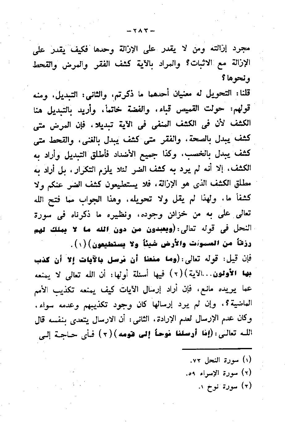 كشف ما، ولهذا لم يقل ولا تحويله، وهذا الجواب مما فتح الله تعالى على به من خزائن وجوده، ونظيره ما ذكرناه في سورة النحل في قول تعالى: (وَيَعْبُدُونَ مِنْ دُونِ اللَّهِ مَا لَا يَمْلِكُ لَهُمْ رِزْقًا مِنَ السَّمَاوَاتِ وَالْأَرْضِ شَيْئًا وَلَا يَسْتَطِيعُونَ) .