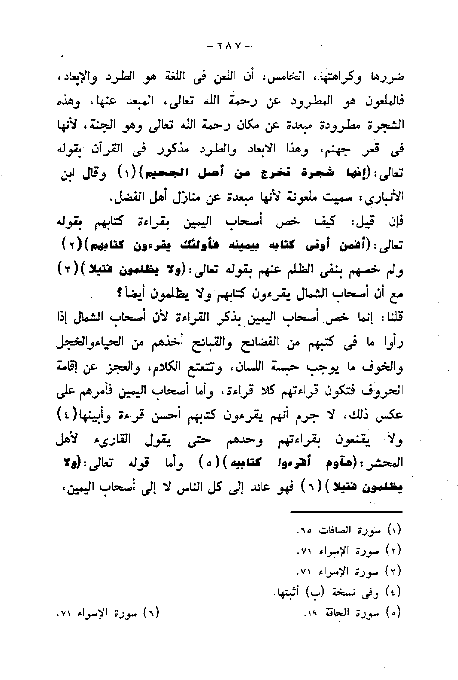 ضررها وكراهتها، الخامس: أن اللعن في اللغة هو الطرد والإبعاد، فالملعون هو المطرود عن رحمة الله تعالى، المبعد عنها، وهذه الشجرة مطرودة مبعدة عن مكان رحمة الله تعالى وهو الجنة، لأنها في قعر جهنم، وهذا الابعاد والطرد مذكور في القرآن بقوله تعالى: (إِنَّهَا شَجَرَةٌ تَخْرُجُ فِي أَصْلِ الْجَحِيمِ)
