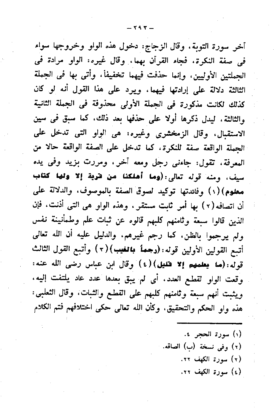 سيف، ومنه قوله تعالى: (وَمَا أَهْلَكْنَا مِنْ قَرْيَةٍ إِلَّا وَلَهَا كِتَابٌ مَعْلُومٌ) وفائدتها توكيد لصوق الصفة بالموصوف، والدلالة على أن اتصافه بها أمر ثابت مستقر، وهذه الواو هى التى أذنت، فإن الذين قالوا سبعة وثامنهم كلبهم قالوه عن ثبات علم وطمأنينة نفس ولم يرجموا بالظن، كما رجم غيرهم، والدليل عليه أن الله تعالى أتبع القولين الأولين قوله: (رَجْمًا بِالْغَيْبِ) وأتبع القول الثالث