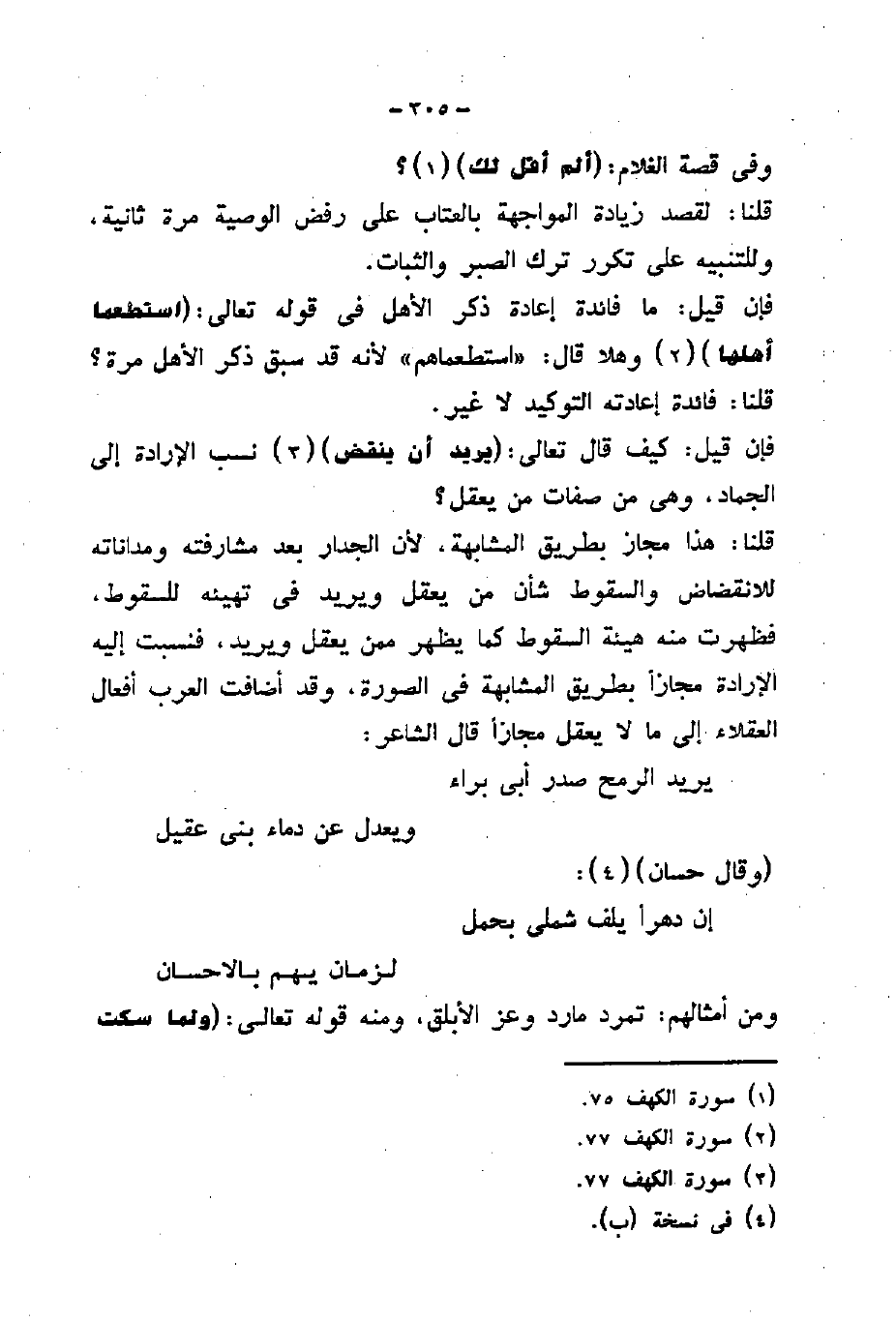 قلنا: هذا مجاز بطريق المشابهة، لأن الجدار بعد مشارفته ومداناته للانقضاض والسقوط شأن من يعقل ويريد في تهيئه للسقوط، فظهرت منه هيئة السقوط كما يظهر ممن يعقل ويريد، فنسبت إليه الإرادة مجازاً بطريق المشابهة في الصورة، وقد أضافت العرب أفعال العقلاء إلى ما لا يعقل مجازاً قال الشاعر: