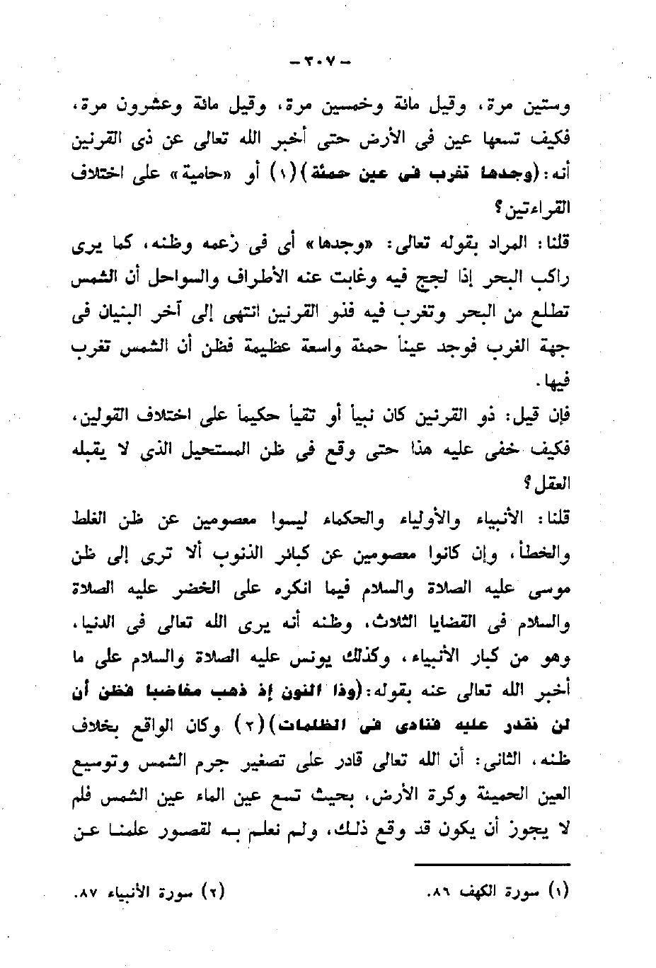 وهو من كبار الأنبياء، وكذلك يونس عليه الصلاة والسلام على ما أخبر الله تعالى عنه بقوله: (وَذَا النُّونِ إِذْ ذَهَبَ مُغَاضِبًا فَظَنَّ أَنْ لَنْ نَقْدِرَ عَلَيْهِ فَنَادَى فِي الظُّلُمَاتِ) وكان الواقع بخلاف ظنه، الثانى: أن الله تعالى قادر على تصغير جرم الشمس وتوسيع العين الحميئة وكرة الأرض، بحيث تسع عين الماء عين الشمس فلم لا يجوز أن يكون قد وقع ذلك، ولم نعلم به لقصور علمنا عن