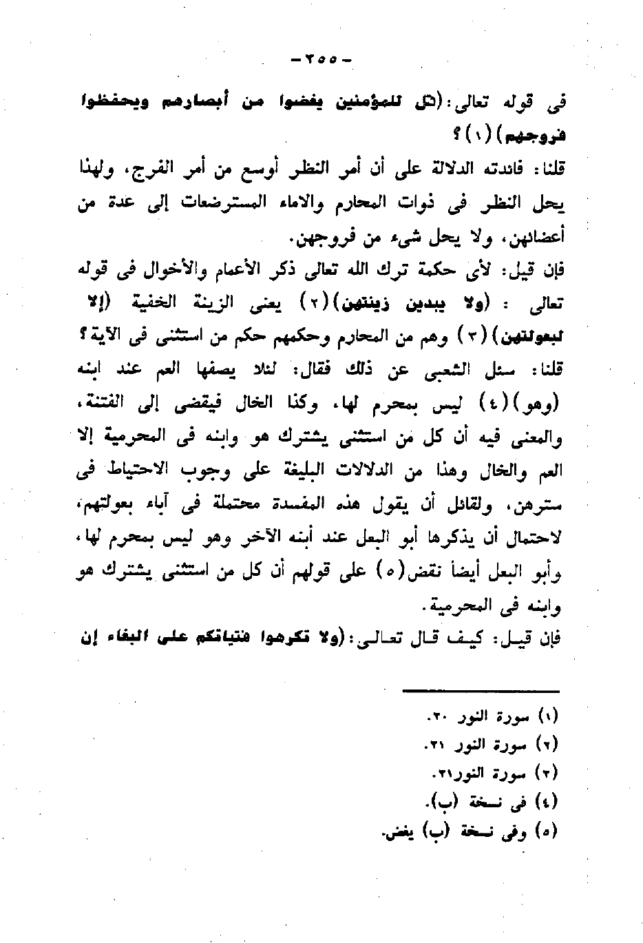 فإن قيل: لأي حكمه ترك الله تعالى ذكر الأعمام والأخوال في قوله تعالى: (وَلَا يُبْدِينَ زِينَتَهُنَّ) يعني الزينه الخفية: (إِلَّا لِبُعُولَتِهِنَّ) وهم من المحارم وحكهم من استثنى في الآية؟ قلنا: سئل الشعبي عن ذلك فقال لئلا يصفها العم عند ابنه وهو ليس بمحرم لها، وكذا الخال فيقضي إلى الفتنة، والمعني فيه أن كل من استثني يشترك هو وابنه في المحرميه إلا العم والخال وهذا من الدلالات البليغه على وجوب الاحتياط في سترهن، ولقائل أن يقول هذا المفسدة محتمله في آباء بعولتهم، لاحتمال أن يذكرها أبو البعل عند ابنه الآخر وهو ليس بمحرم لها وأبو البعل أيضاً نقض على قولهم أن كل من استثني يشترك هو وابنه في المحرميه.