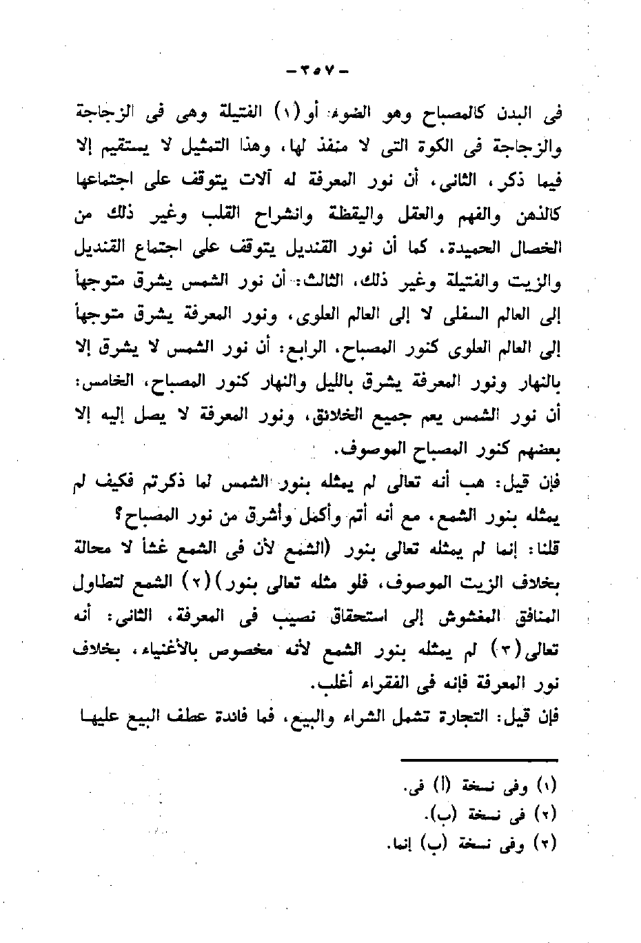 فى البدن كالمصباح وهو الضوء أو الفتيله وهى في الزجاجه والزجاجه في الكوه التى لا منفذ لها، وهذا التمثيل لا يستقيم إلا في ذكر، الثانى، أن نور المعرفه له آلات يتوقف على اجتماعها كالذهن والفهم والعقل واليقظه وانشراح القلب وغير ذلك من الخصال الحميده، كما أن نور القنديل يتوقف على اجتماع القنديل والزيت والفتيل وغير ذلك، الثالث: أن نور الشمس يشرق متوجها إلى العالم السفلي لا إلى العالم العلوي، ونور المعرفه يشرق متوجها إلى العالم العلوي كنور المصباح، الرابع: أن نور الشمس لا يشرق إلا بالنهار ونور المعرفه يشرق بالليل والنهار كنور المصباح، الخامس: أن نور الشمس يعم جميع الخلائق ونور المعرفه، لا يصل إليه إلا بعضهم كنور المصباح الموصوف.