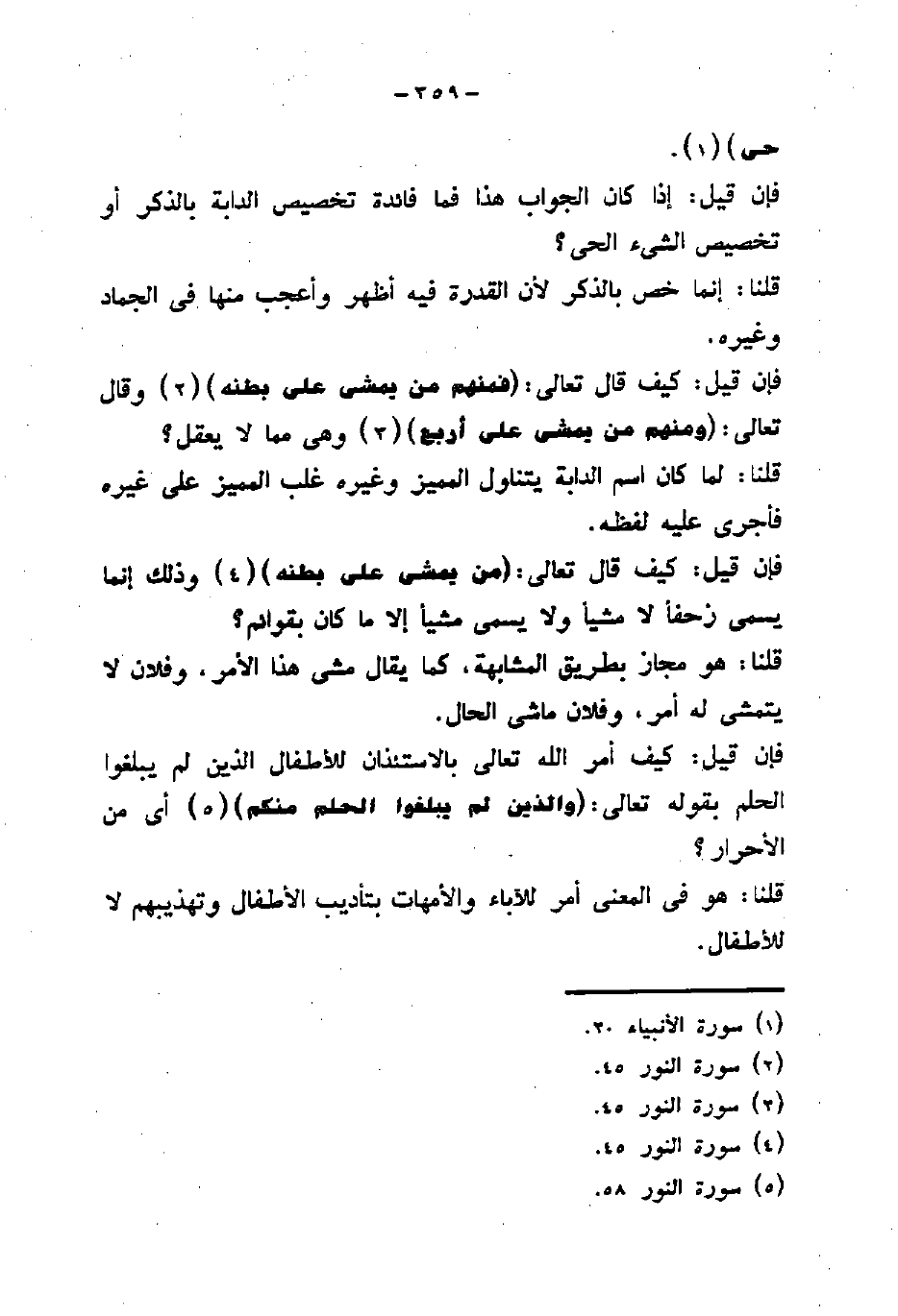 فإن قيل: كيف قال تعالى: (فَمِنْهُمْ مَنْ يَمْشِي عَلَى بَطْنِهِ) وقال تعالى: (وَمِنْهُمْ مَنْ يَمْشِي عَلَى أَرْبَعٍ) وهى مما لايعقل؟