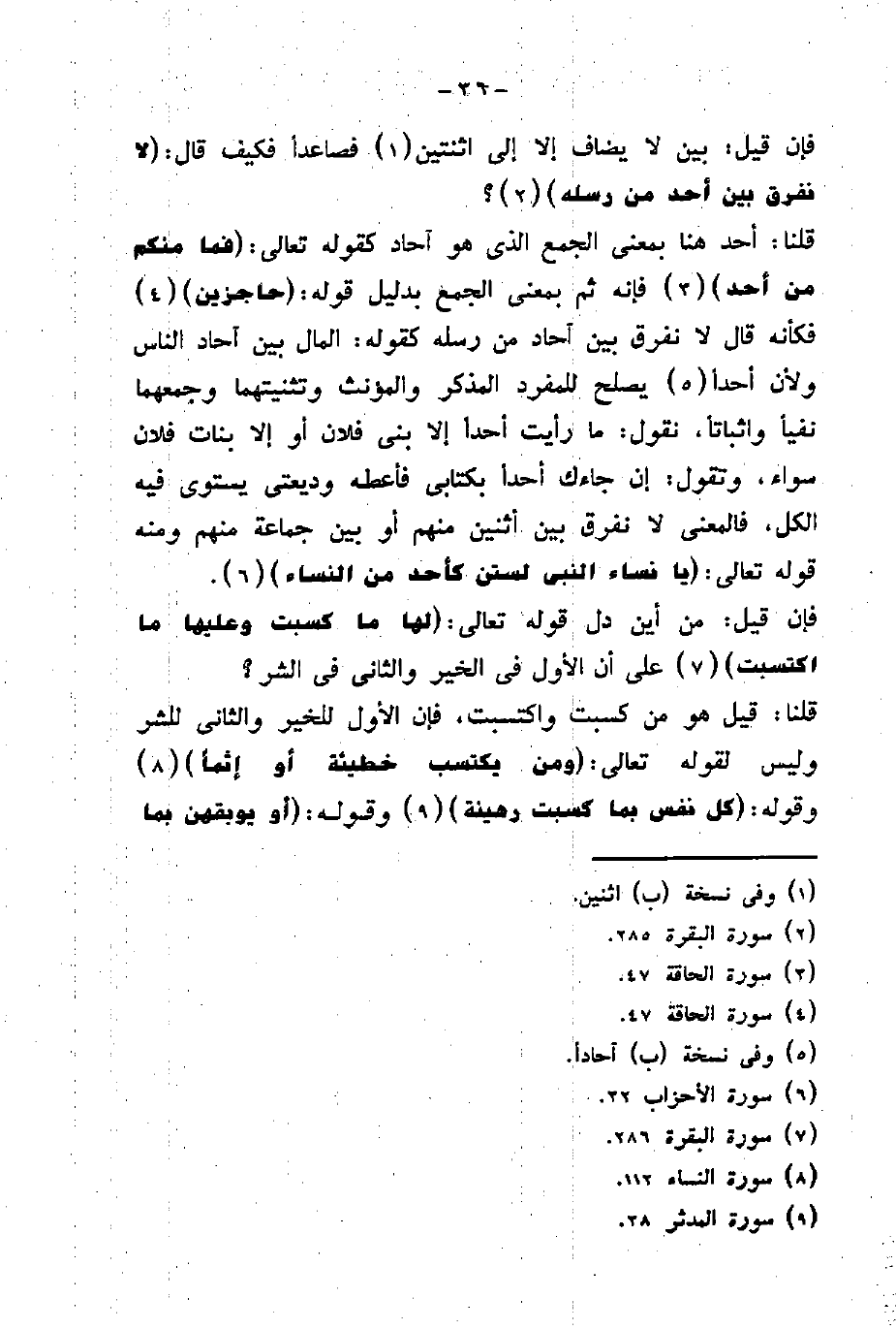 سواء، وتقول إن جاءك أحداً بكتابى فأعطه وديعتى يستوى فيه الكل، فالمعنى لا نفرق بين أثنين منهم أو بين جماعة منهم ومنه