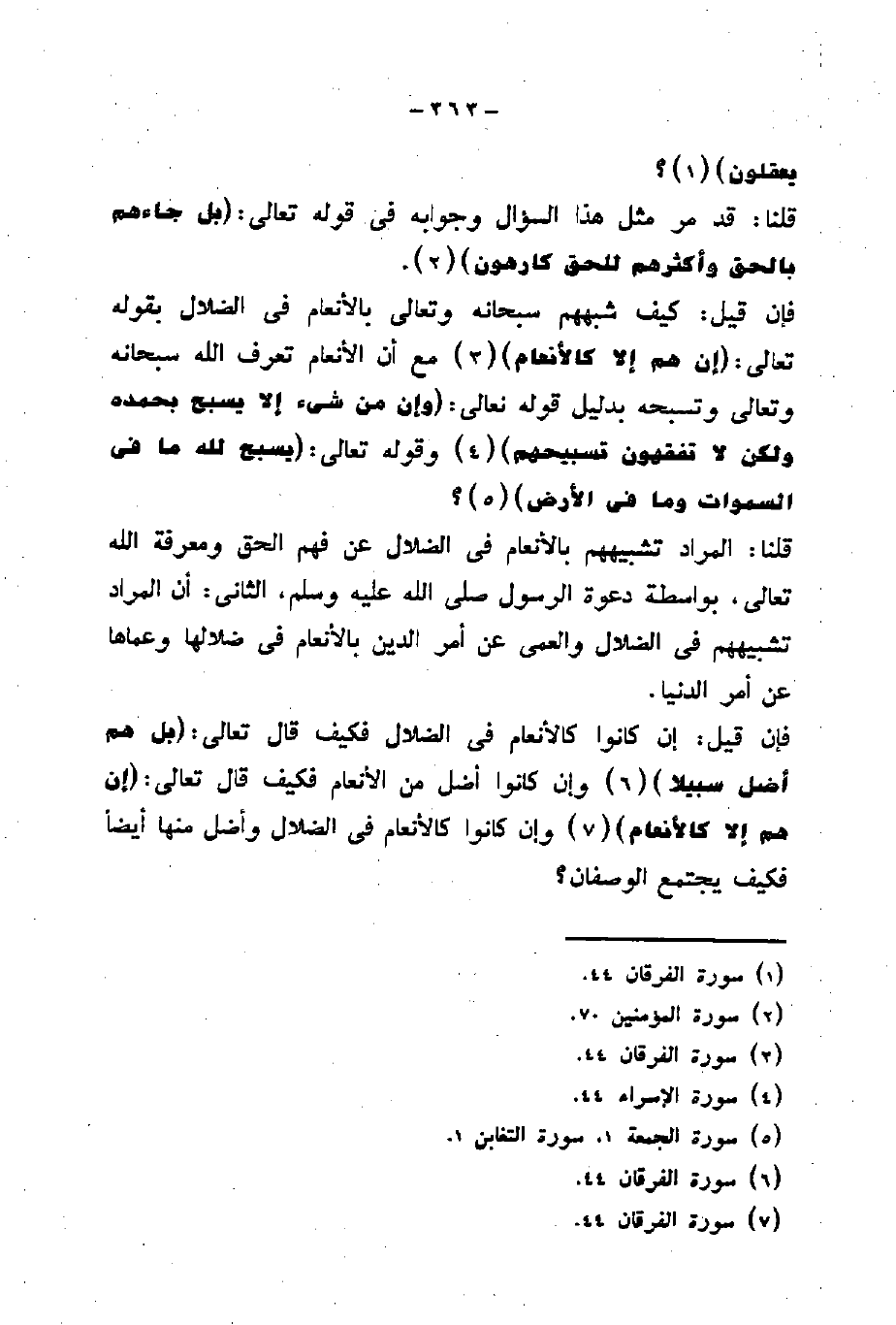 قلنا: المراد تشبيههم بالأنعام في الضلال عن فهم الحق ومعرفة الله تعالى بواسطة دعوة الرسول صلى الله عليه وسلم، الثانى: أن المراد تشبيههم في الضلال والعمى عن أمر الدين بالأنعام في ضلالها وعماها عن أمر الدنيا.