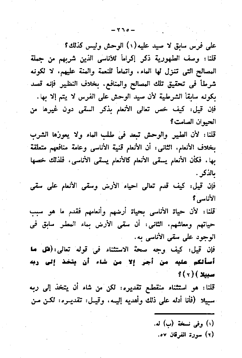 قلنا: وصف الطهورية ذكر إكراما للأناسي الذين شربهم من جمله المصالح التى تنزل لها الماء، وتماماً للنعمة والمنة عليهم، لا لكونه شرطاً في تحقيق تلك المصالح والمنافع، بخلاف النظير فإنه قصد بكونه سابقاً الشرطيه لأن صيد الوحش على الفرس لا يتم إلا بها.