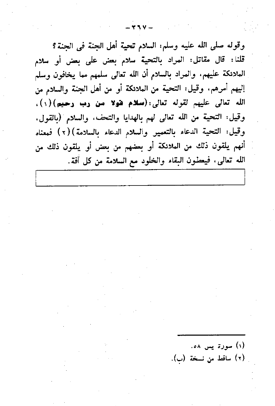 قلنا: قال مقاتل: المراد بالتحية سلام بعض على بعض أو سلام الملآئكه عليهم والمراد بالسلام أن الله تعالى سلمهم مما ياخافون وسلم إليهم أمرهم وقيل التحيه من الملآئكه أو من أهل الجنه من الله تعالى عليهم لقوله تعالى: (سَلَامٌ قَوْلًا مِنْ رَبٍّ رَحِيمٍ) .