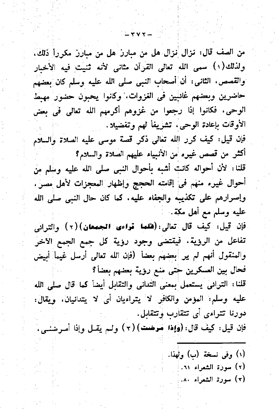 من الصف قال نزال نزال هل من مبارز هل من مبارز مكرراً ذلك ولذلك سمى الله تعال القرآن مثاني لأنه ثنيت فيه الأخبار والقصص، الثاني: أن أصحاب النبي صلى الله عليه وسلم كان بعضهم حاضرين وبعضهم غائبين في الغزوات وكان يحبون حضور مهبط الوحي فكان إذا رجعوا من غزوهم أكرمهم الله تعالى في بعض الأوقات بإعاده الوحي تشريفا لهم وتفضيلا.