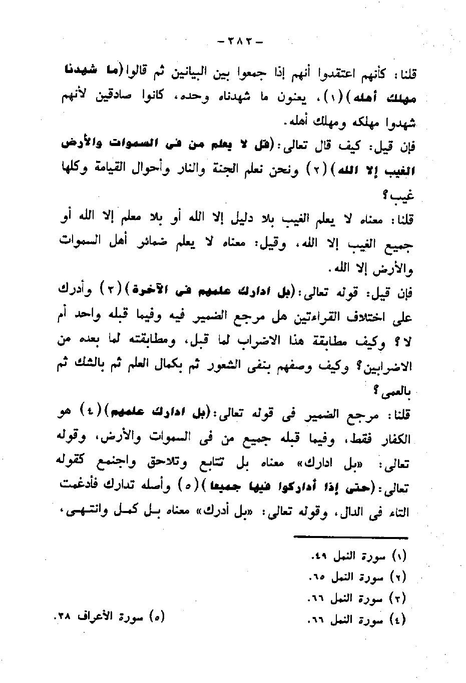 (بَلِ ادَّارَكَ عِلْمُهُمْ) الكفار فقط، وفيما قبله جميع من في السموات والأرض، وقوله تعالى: "بل ادارك" معناه بل تتابع وتلاحق واجتمع كقوله تعالى: (حَتَّى إِذَا ادَّارَكُوا فِيهَا جَمِيعًا) وأصله تدارك فأدغمت التاء في الدال، وقوله تعالى: "بل ادرك " معناه بل كمل وانتهى،