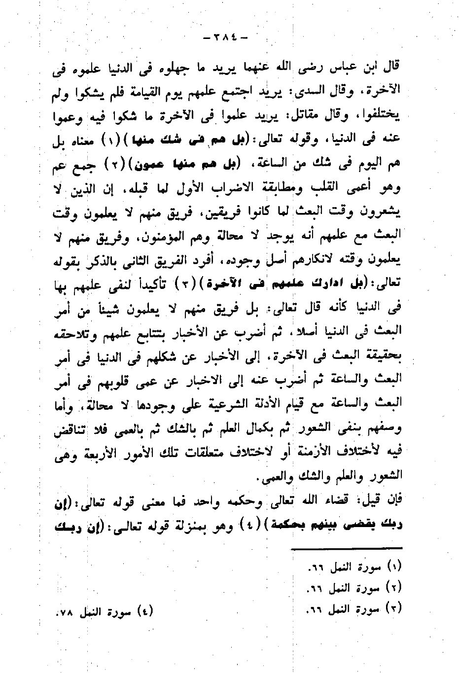 عنه في الدنيا، وقوله تعالى: (بَلْ هُمْ فِي شَكٍّ مِنْهَا) معناه بل هم اليوم في شك من الساعة، (بل هم منها عمون) جمع عم: وهو أعمى القلب ومطابقة الاضراب الأول لما قبله، إن الذين لا يشعرون وقت البعث لما كانوا فريقين، فريق منهم لا يعلمون وقت البعث مع علمهم أنه يوجد لا محالة وهم المؤمنون، وفريق منهم لا يعلمون وقته لإنكارهم أصل وجوده، أفرد الفريق الثانى بالذكر بقوله تعالى: (بَلِ ادَّارَكَ عِلْمُهُمْ فِي الْآخِرَةِ) تأكيداً لنفى علهم بها
