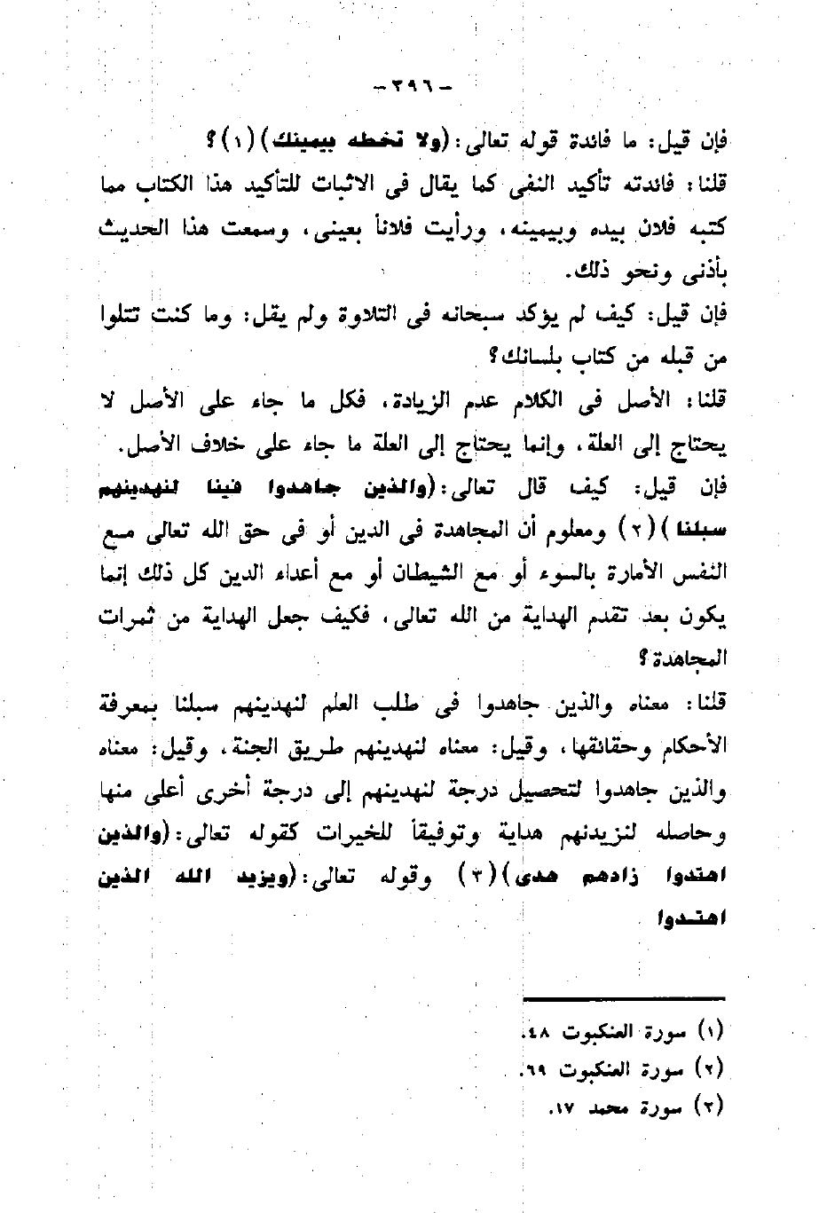 فإن قيل: كيف قال تعالى: (واوَالَّذِينَ جَاهَدُوا فِينَا لَنَهْدِيَنَّهُمْ سُبُلَنَا) ومعلوم أن المجاهدة في الدين أو في حق الله تعالى مع النفس الأمارة بالسوء أو مع الشيطان أو مع أعداء الدين كل ذلك إنما يكون بعد تقدم الهدية من الله تعالى، فكيف جعل الهداية من ثمرات