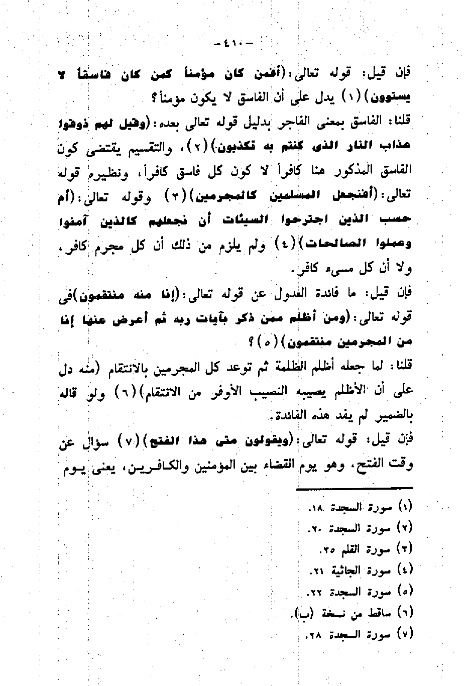 قلنا: الفاسق بمعنى الفاجر بدليل قوله تعالى بعده: (وَقِيلَ لَهُمْ ذُوقُوا عَذَابَ النَّارِ الَّذِي كُنْتُمْ بِهِ تُكَذِّبُونَ) ، والتقسيم يقتضى كون الفاسق المذكور هنا كافراً لا كون كل فاسق كافراً، ونظيره قوله تعالى: (أَفَنَجْعَلُ الْمُسْلِمِينَ كَالْمُجْرِمِينَ) وقوله تعالى: (أَمْ حَسِبَ الَّذِينَ اجْتَرَحُوا السَّيِّئَاتِ أَنْ نَجْعَلَهُمْ كَالَّذِينَ آمَنُوا وَعَمِلُوا الصَّالِحَاتِ) ولم يلزم من ذلك أن كل مجرم كافر، ولا أن كل مسيء كافر.