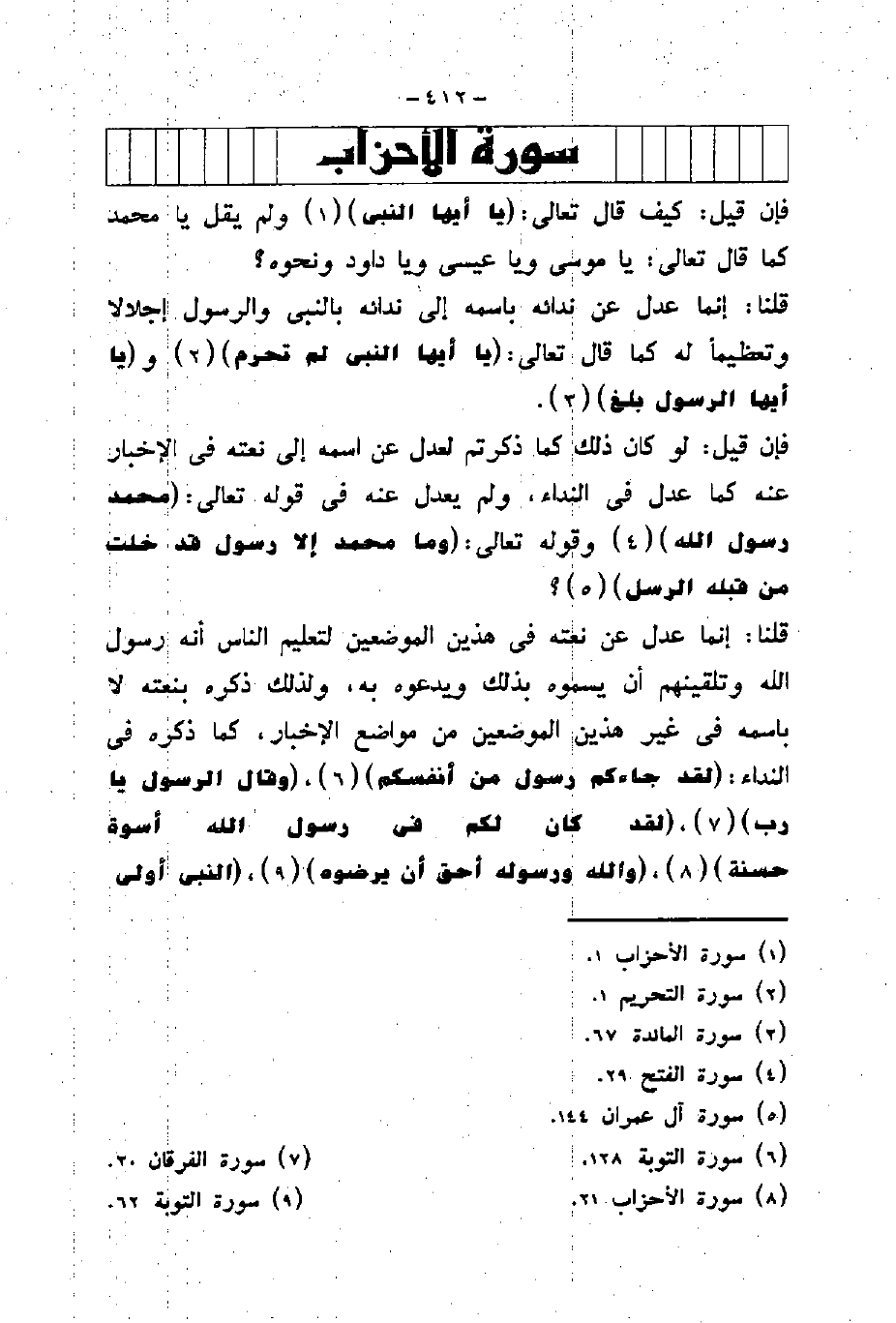 فإن قيل: لو كان ذلك كما ذكرتم لعدل عن اسمه إلى نعته في الإخبار عنه كما عدل في النداء، ولم يعدل عنه في قوله تعالى: (مُحَمَّدٌ رَسُولُ اللَّهِ) وقوله تعالى: (وَمَا مُحَمَّدٌ إِلَّا رَسُولٌ قَدْ خَلَتْ مِنْ قَبْلِهِ الرُّسُلُ) ؟