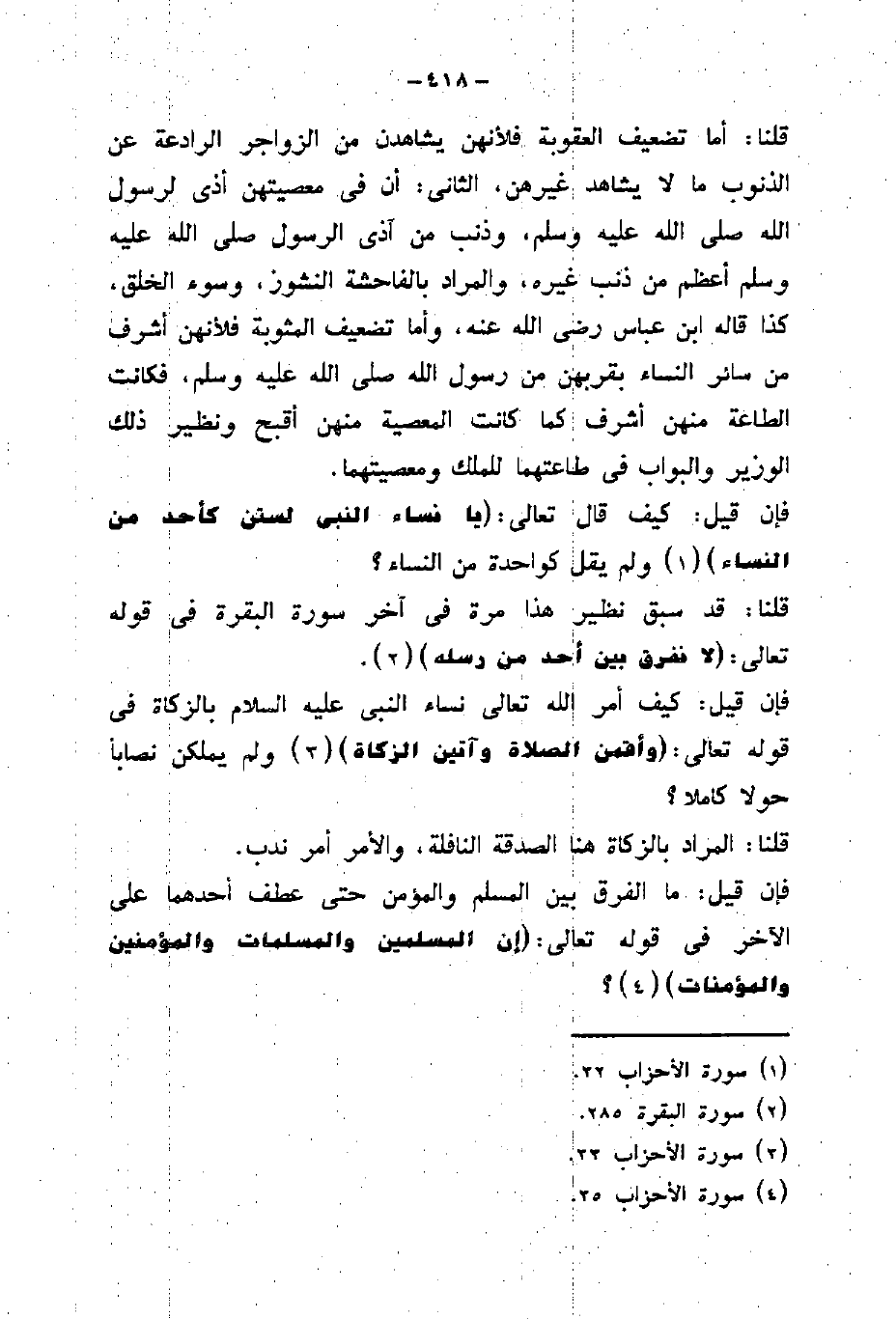 فإن قيل: كيف أمر الله تعالى نساء النبى عليه السلام بالزكاة في قوله تعالى: (وَأَقِمْنَ الصَّلَاةَ وَآتِينَ الزَّكَاةَ) ولم يملكن نصاباً حولا كاملا؟