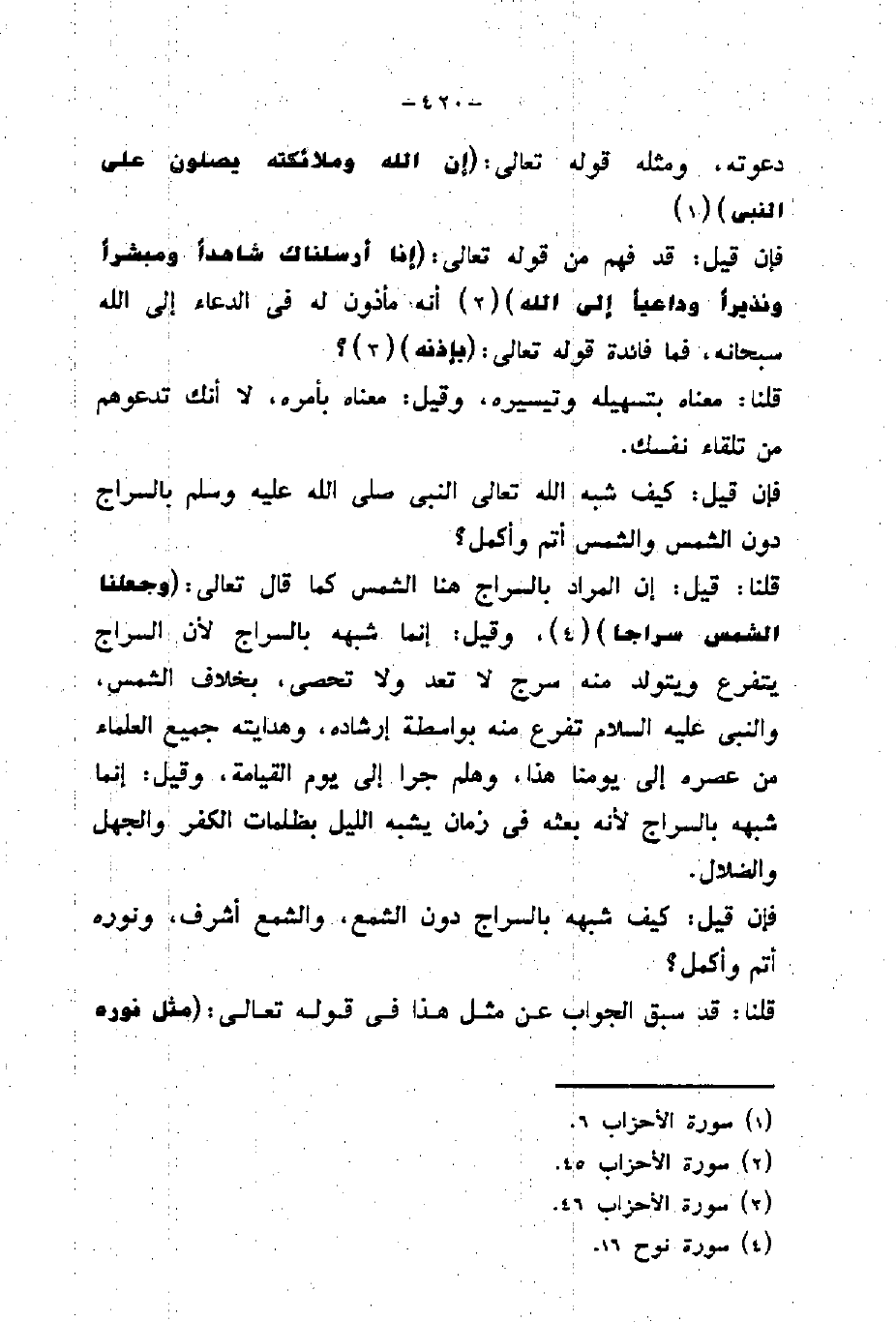 يتفرع ويتولد منه سرج لا تعد ولا تحصى، بخلاف الشمس، والنبى عليه السلام تفرع منه بواسطة إرشاده، وهدايته جميع العلماء من عصره إلى يومنا هذا، وهلم جرا إلى يوم القيامة، وقيل: إنما
