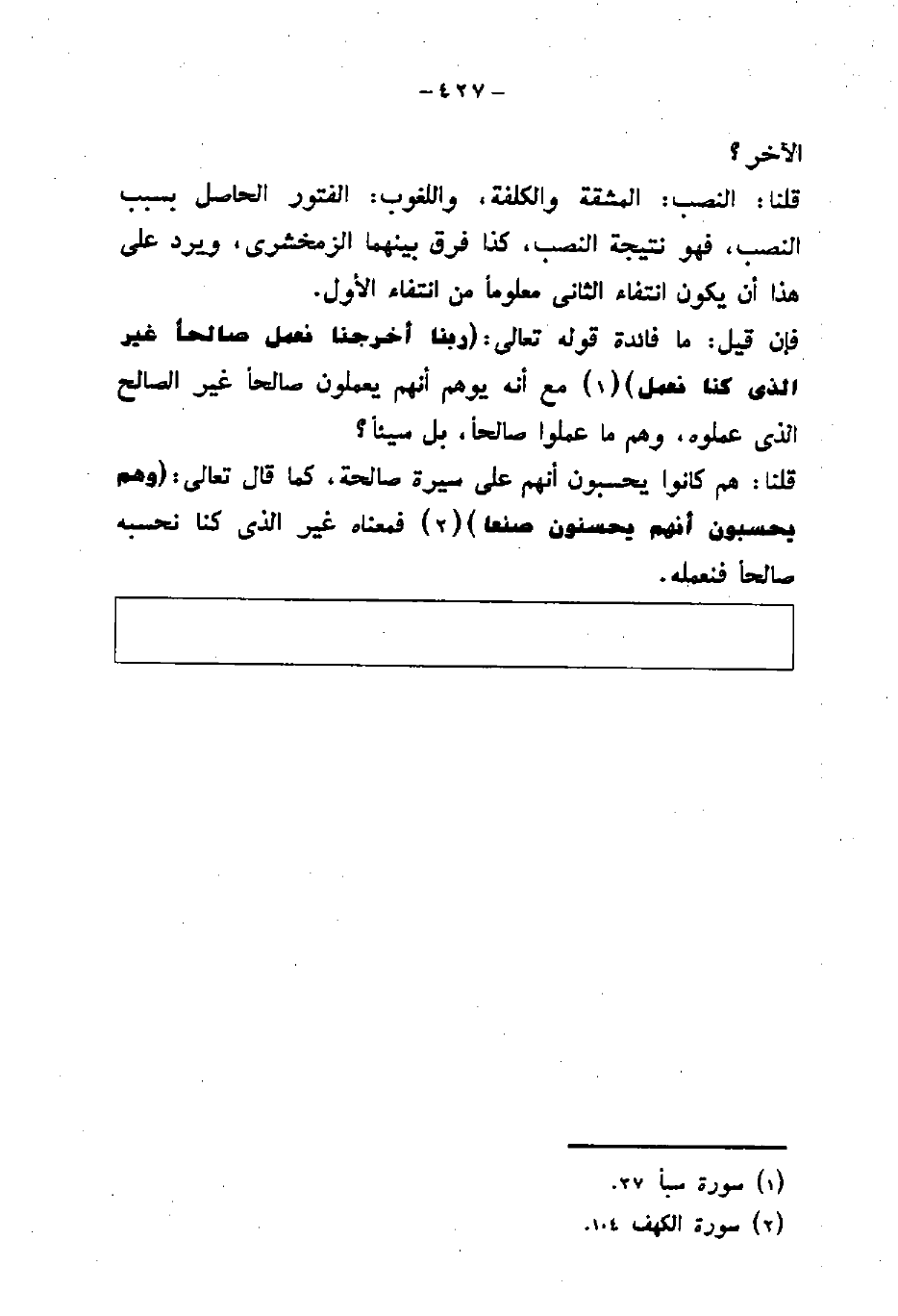 فإن قيل: ما فائدة قوله تعالى: (رَبَّنَا أَخْرِجْنَا نَعْمَلْ صَالِحًا غَيْرَ الَّذِي كُنَّا نَعْمَلُ) مع أنه يوهم أنهم يعملون صالحاً غير الذي عملوه، وهم ما عملوا صالحاً، بل سيئاً؟