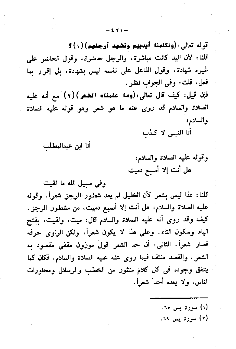 قلنا: هذا ليس بشعر لأن الخليل لم يعد شطور الرجز شعراً، وقوله عليه الصلاة والسلام: هل أنت إلا أصبع دميت، من مشطور الرجز، كيف وقد ووى أنه عليه الصلاة والسلام قال: ميت، ولقيت، بفتح الياء وسكون التاء، وعلى هذا لا يكون شعراً، ولكن الراوى حرفه فصار شعراً.