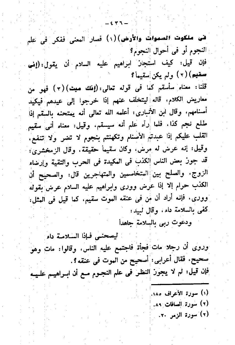 قلنا: معناه سأسقم كما في قوله تعالى: (إنك ميت) فهو من معاريض الكلام، قاله ليتخلف عنهم إذا خرجوا إلى عيدهم فيكيد أصنامهم، وقال ابن الأنبارى: أعلمه الله تعالى أنه يمتحنه بالسقم إن طلع نجم كذا، فلما رآه علم أنه سقيم، وقيل: معناه أنى سقيم القلب عليكم إذا عبدتم الأصنام وتكهنتم بنجوم لا تضر ولا تنفع.