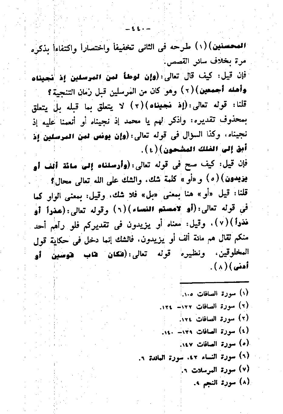 قلنا: قيل "أو" هنا بمعنى "بل" فلا شك، وقيل: بمعنى الواو كما في قوله تعالى: (أَوْ لَامَسْتُمُ النِّسَاءَ) وقوله تعالى: (عُذْرًا أَوْ نُذْرًا) ، وقيل: معناه أو يزيدون في تقديركم فلو رآهم أحد منكم لقال هم مائة ألف أو يزيدون، فالشك إنما دخل في حكاية قول المخلوقين، ونظيره قوله تعالى: (فَكَانَ قَابَ قَوْسَيْنِ أَوْ أَدْنَى) .