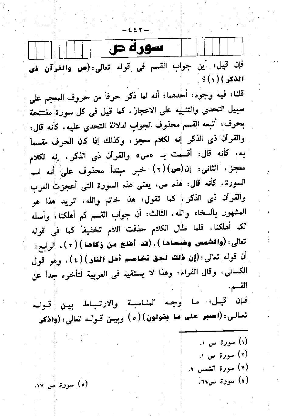 والقرآن ذى الذكر إنه لكلام معجز، وكذلك إذا كان الحرف مقسماً به، كأنه قال: أقسمت، بـ "ص" والقرآن ذى الذكر، إنه لكلام