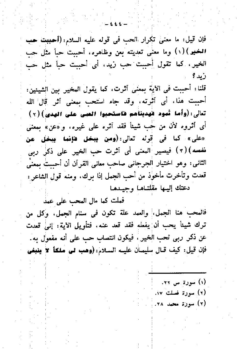 الثانى: وهو اختيار الجرجانى صاحب معانى القرآن أن أحببت بمعنى قعدت وتأخرت مأخوذ من أحب الجمل إذا برك، ومنه قول الشاعر: