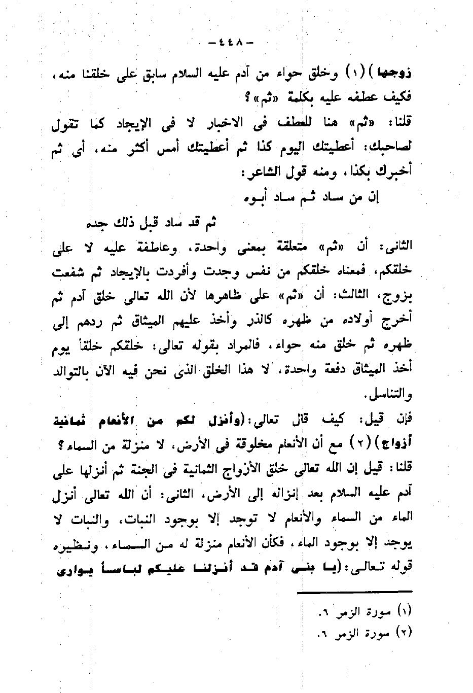 الثانى: أن " ثم " متعلقة بمعنى واحدة، وعاطفة عليه لا على خلقكم، فمعناه خلقكم من نفس وجدت وأفردت بالإيجاد ثم شفعت بزوج، الثالث: أن " ثم " على ظاهرها لأن الله تعالى خلق آدم ثم
