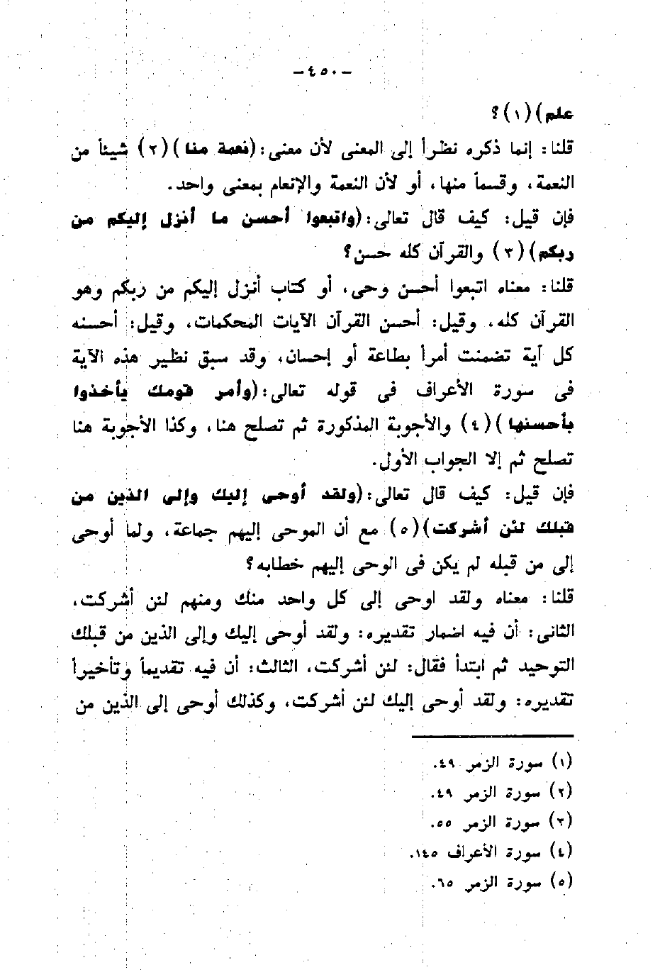 قلنا: معناه اتبعوا أحسن وحي , أو كتاب أنزل اليكم من ربكم وهو القرآن كله , وقيل: أحسن القرآن الآيات المحكمات , وقيل: أحسنه كل آية تضمنت أمراً بطاعة أو إحسان , وقد سبق نظير هذه الآية في سورة الأعراف في قوله تعالى: (وَأْمُرْ قَوْمَكَ يَأْخُذُوا بِأَحْسَنِهَا) والأجوبة المذكورة ثم تصلح هنا , وكذا الأجوبة هنا تصلح ثم إلا الجواب الأول.