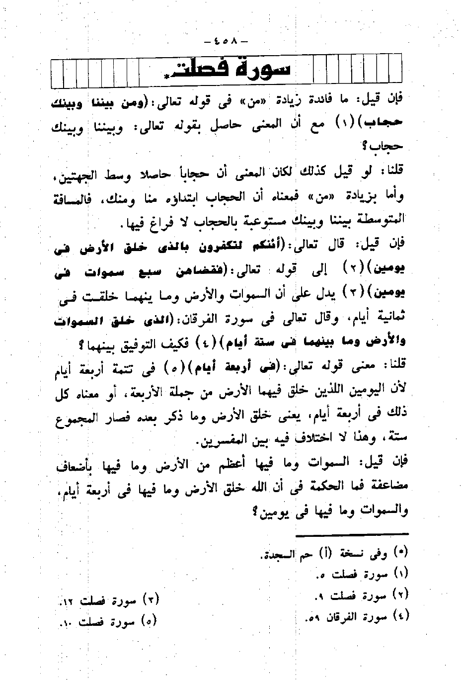 فإن قيل: قال تعالى: (قُلْ أَئِنَّكُمْ لَتَكْفُرُونَ بِالَّذِي خَلَقَ الْأَرْضَ فِي يَوْمَيْنِ) إلى قوله تعالى: (فَقَضَاهُنَّ سَبْعَ سَمَاوَاتٍ فِي يَوْمَيْنِ) يدل على أن السموات والأرض وما ينهما خلقت في ثمانية أيام، وقال تعالى في سورة الفرقان: (وَلَقَدْ خَلَقْنَا السَّمَاوَاتِ وَالْأَرْضَ وَمَا بَيْنَهُمَا فِي سِتَّةِ أَيَّامٍ) فكيف التوفيق بينهما؟