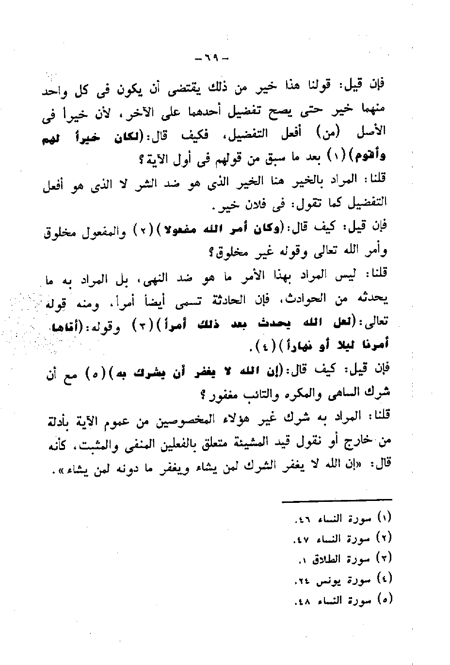 قلنا: المراد به شرك غير هؤلآء المخصوصين من عموم الآية بأدلة من خارج أو نقول قيد المشيئة متعلق بالفعلين المنفى والمثبت، كأنه قال: "إن الله لا يغفر الشرك لمن يشاء ويغفر ما دونه لمن يشاء ".