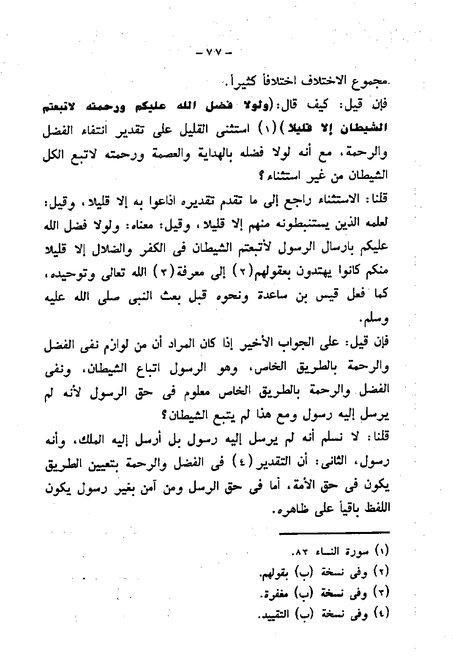 فإن قيل: كيف قال: (وَلَوْلَا فَضْلُ اللَّهِ عَلَيْكُمْ وَرَحْمَتُهُ لَاتَّبَعْتُمُ الشَّيْطَانَ إِلَّا قَلِيلًا) . استثني القليل على تقدير انتفاء الفضل والرحمة، مع أنه لولا فضله بالهداية والعصمة ورحمته لاتبع الكل الشيطان من غير استثناء؟