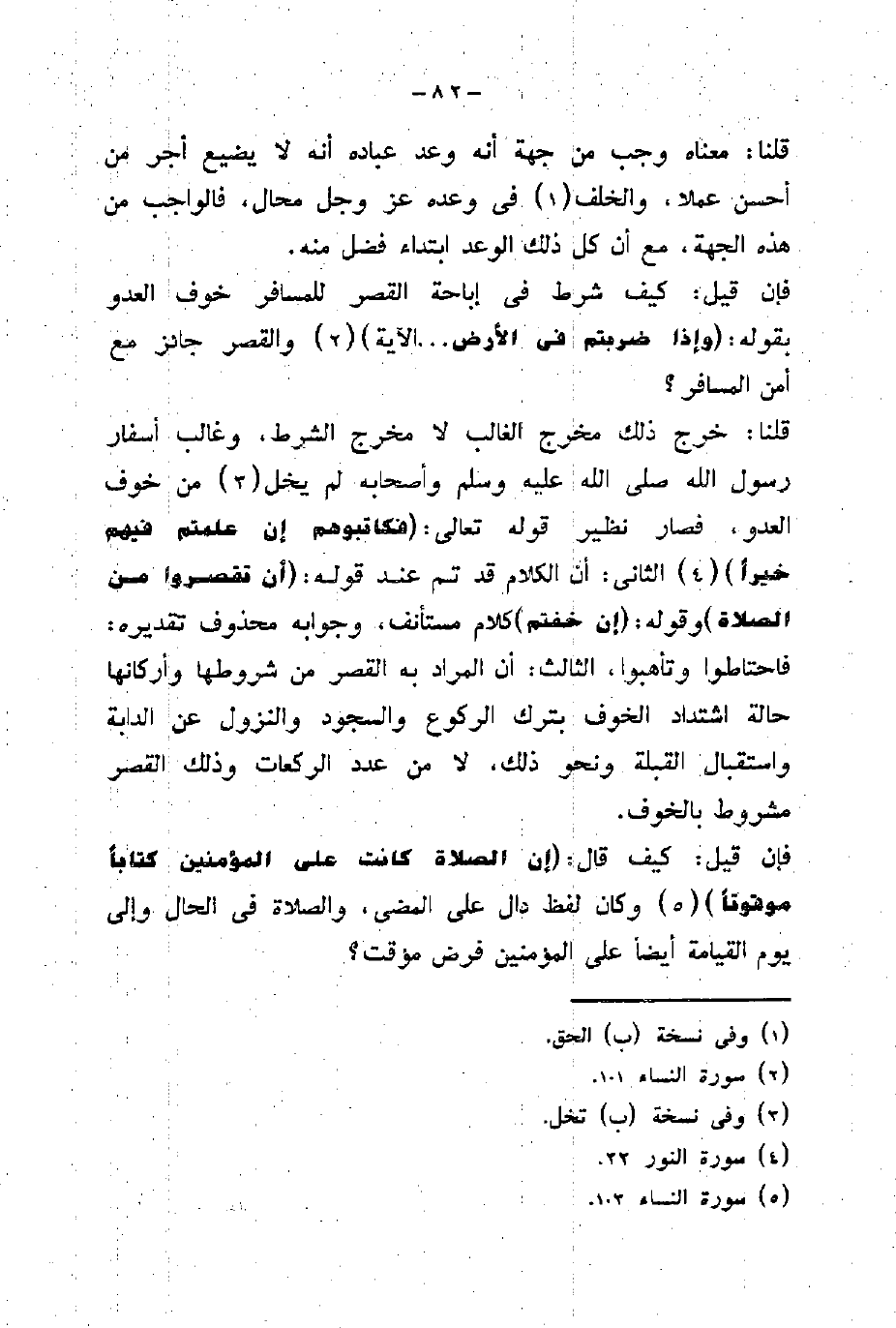 وقوله: (إِنْ خِفْتُمْ) كلام مستأنف، وجوابه محذوف تقديره: فاحتاطوا وتأهبوا، الثالث: أن المراد به القصر من شروطها وأركانها
