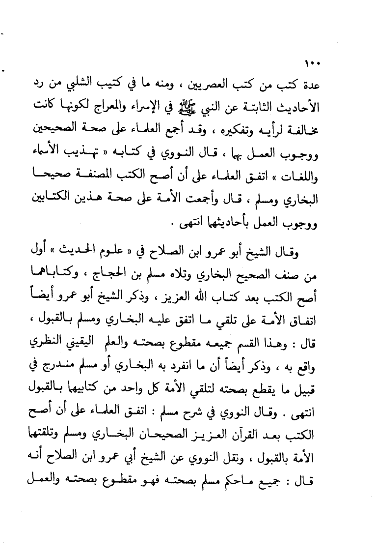 وقال الشيخ أبو عمرو ابن الصلاح في «علوم الحديث» أول من صنف الصحيح البخاري وتلاه مسلم بن الحجاج, وكتاباهما أصح الكتب بعد كتاب الله العزيز, وذكر الشيخ أبو عمرو أيضاً اتفاق الأمة على تلقي ما اتفق عليه البخاري ومسلم بالقبول, قال: وهذا القسم جميعه مقطوع بصحته والعلم اليقيني النظري واقع به, وذكر أيضاً أن ما انفرد به البخاري أو مسلم مندرج في قبيل ما يقطع بصحته لتلقي الأمة كل واحد من كتابيهما بالقبول انتهى. وقال النووي في شرح مسلم: اتفق العلماء على أن أصح الكتب بعد القرآن العزيز الصحيحان البخاري ومسلم وتلقتهما الأمة بالقبول, ونقل النووي عن الشيخ أبي عمرو ابن الصلاح أنه قال: جميع ما حكم مسلم بصحته فهو مقطوع بصحته والعمل