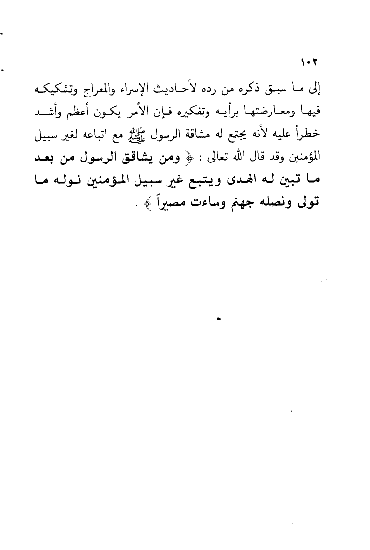 إلى ما سبق ذكره من رده لأحاديث الإسراء والمعراج وتشكيكه فيها ومعارضتها برأيه وتفكيره فإن الأمر يكون أعظم وأشد خطراً عليه لأنه يجتمع له مشاقة الرسول - صلى الله عليه وسلم - مع اتباعه لغير سبيل المؤمنين وقد قال الله تعالى: {ومن يشاقق الرسول من بعد ما تبين له الهدى ويتبع غير سبيل المؤمنين نوله ما تولى ونصله جهنم وساءت مصيراً}.