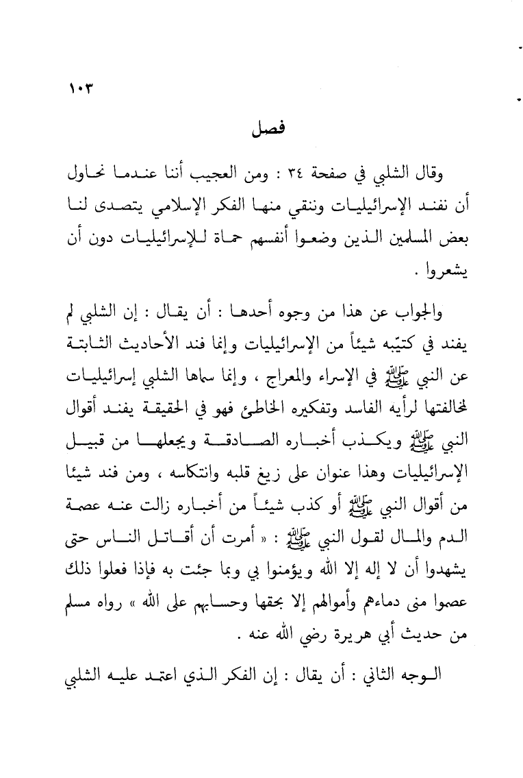 والجواب عن هذا من وجوه أحدها: أن يقال: إن الشلبي لم يفند في كتيّبه شيئاً من الإسرائيليات وإنما فند الأحاديث الثابتة عن النبي - صلى الله عليه وسلم - في الإسراء والمعراج, وإنما سماها الشلبي إسرائيليات لمخالفتها لرأيه الفاسد وتفكيره الخاطئ فهو في الحقيقة يفند أقوال النبي - صلى الله عليه وسلم - ويكذب أخباره الصادقة ويجعلها من قبيل الإسرائيليات وهذا عنوان على زيغ قلبه وانتكاسه, ومن فند شيئا من أقوال النبي - صلى الله عليه وسلم - أو كذب شيئاً من أخباره زالت عنه عصمة الدم والمال لقول النبي - صلى الله عليه وسلم -: «أمرت أن أقاتل الناس حتى يشهدوا أن لا إله إلا الله ويؤمنوا بي وبما جئت به فإذا فعلوا ذلك عصموا مني دماءهم وأموالهم إلا بحقها وحسابهم على الله» رواه مسلم من حديث أبي هريرة رضي الله عنه.